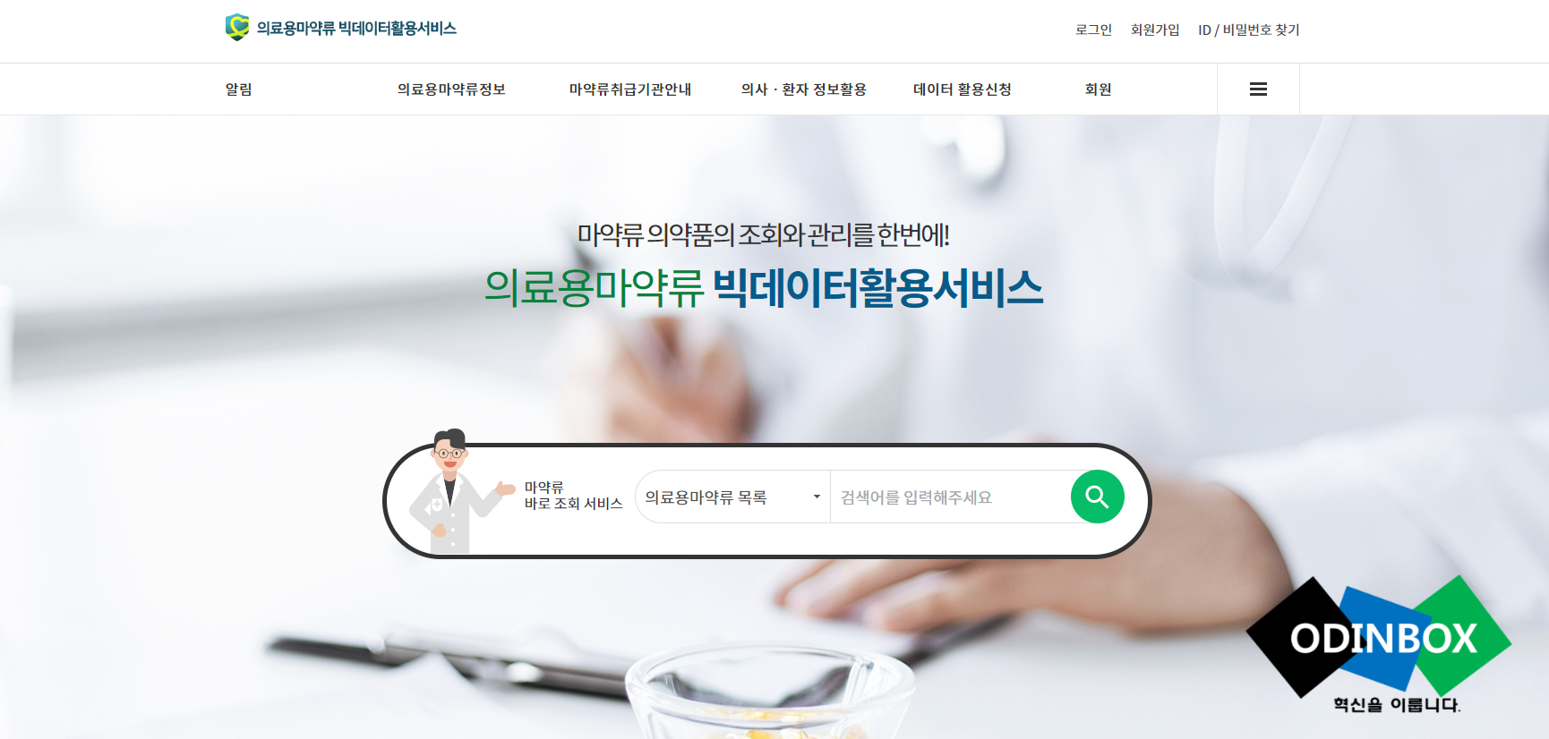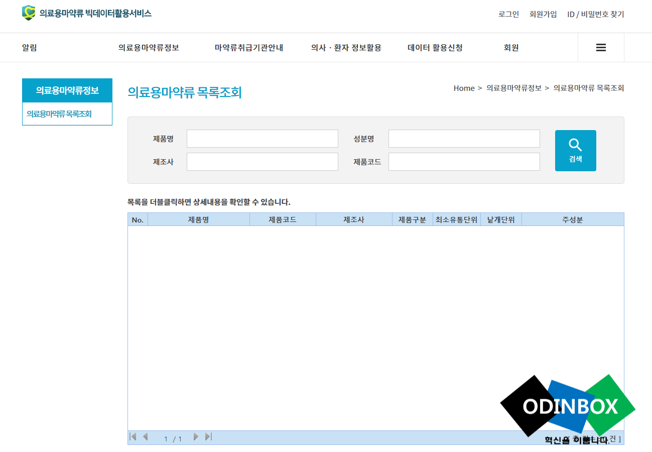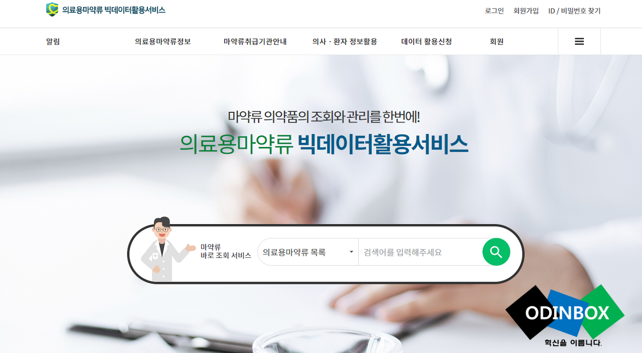 의료용마약류 정보, 마약류 취급기관, 의사/환자 정보활용(투약내역 조회(환자용), 데이터활용신청, 회원 등으로 이뤄져있습니다.