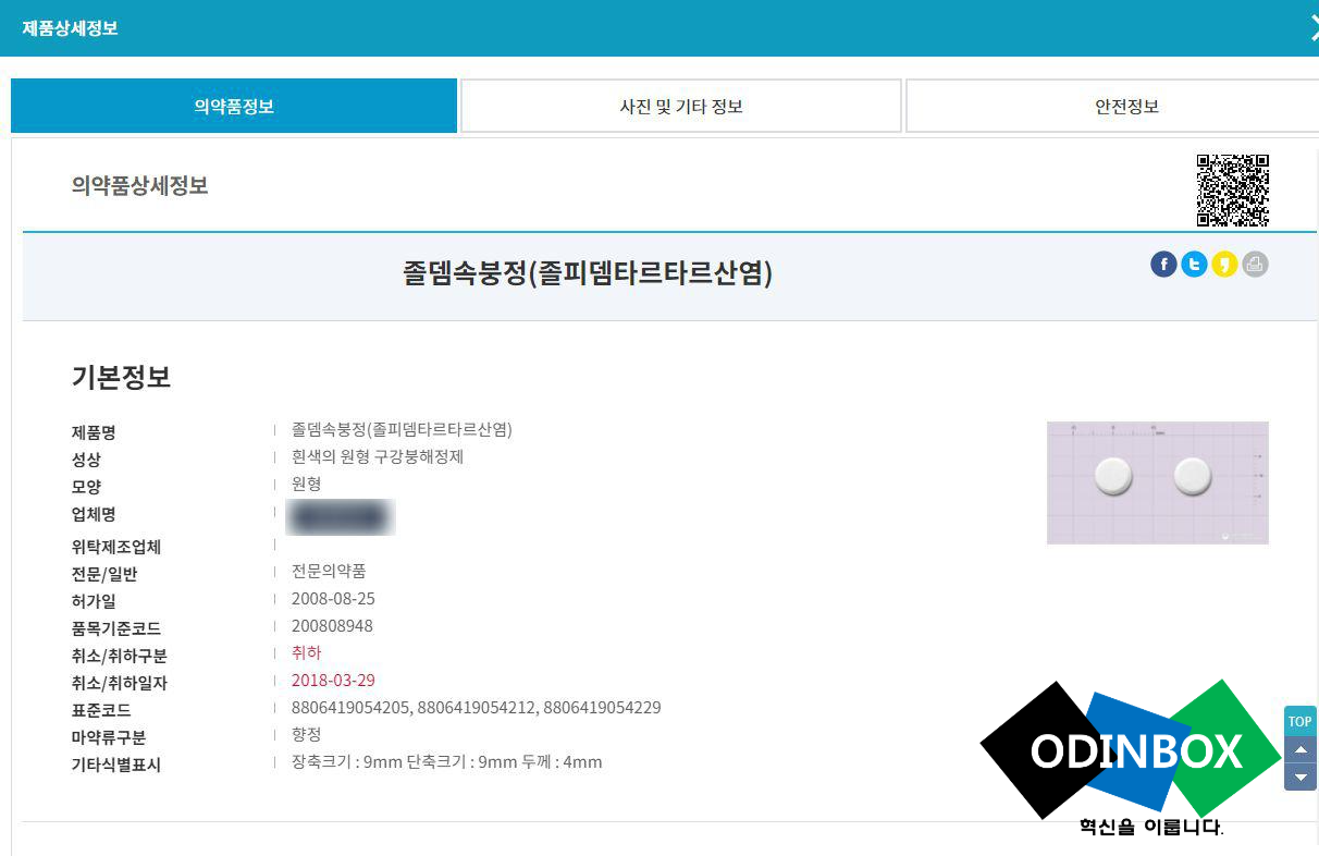 해당 의약품에 상세정보를 알 수 있습니다. 보시면 생산업체와 성상, 모양, 위탁제조업체, 전문/일반, 품목기준코드, 표준코드, 마약류구분, 기타식별코드, 사진, 기타, 안전정보 등으로 확인을 할 수 있습니다.