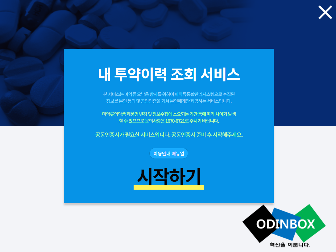 홈페이지 상단 메뉴에서 의사/환자 정보활용에서 투약내역 조회(환자용)을 누릅니다.