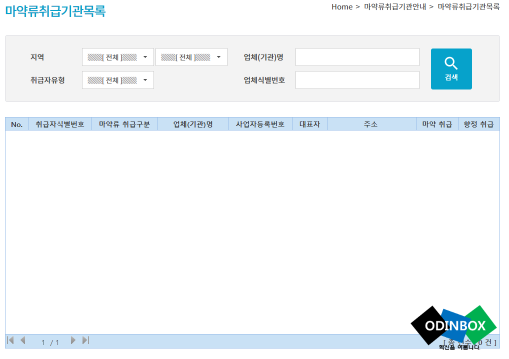지역을 검색을 하면 위와 같이 조회가 가능합니다. 취급자식별번호, 마약류 취급구분, 업체(기관)명, 사업자등록번호, 대표자, 주소, 마약취급, 항정 취급등을 확인을 할 수 있습니다.