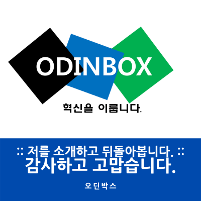 로고를 만들게 된 것은 단순합니다. 나의 이름을 만들었는데 나의 이름을 대신하는 이미지(로고)를 만들면 어떨까?라는 생각으로 고민을 하기 시작했습니다. 하지만 포토샵도 할 줄 몰라 어떻게 만들어야지 고민을 하다 당시 파워포인트를 이용해서 만들기 시작했습니다. 박스라는 글과 함께 네모난 도형을 넣었고 총 세 개의 상자를 넣었습니다. (검은색, 파란색, 초록색)으로 했고 각 색에 의미를 부여했습니다. 검은색의 경우 어둠을 뜻하고, 파란색의 경우 빛을 뜻하며, 초록색은 세상의 모든 시작이라는 뜻을 부여했고 그 위에 ODINBOX의 글자를 넣게 되었고 그 밑에 저의 비전인 "혁신을 이룹니다."와 함께 로고를 만들었습니다.