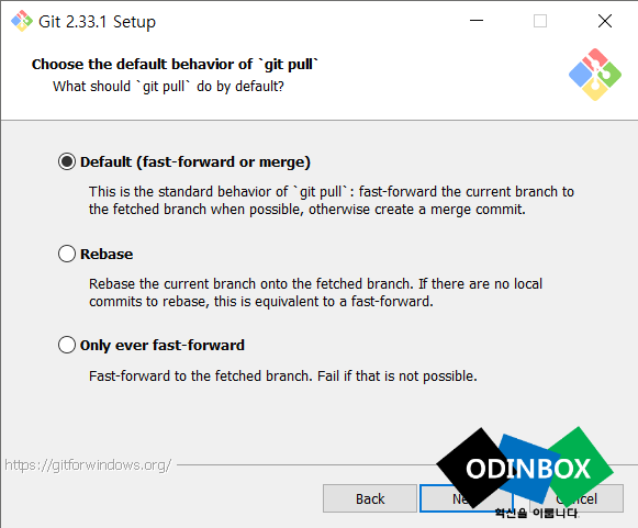 필요한 구성요소를 선택할 수 있습니다. 원하는 구성요소를 선택을 한 후 Next를 누르고 git의 기본 에디터(Editor)를 선택 할 수 있습니다. VScode를 이용하려고 저의 경우 use Visual Studio Code as Git's default ediotr를 선택하였습니다. 그 후 시작 메뉴 설정에서 기본으로 사용을 하여 바로 Next를 누릅니다.