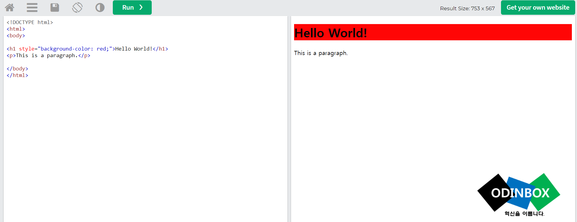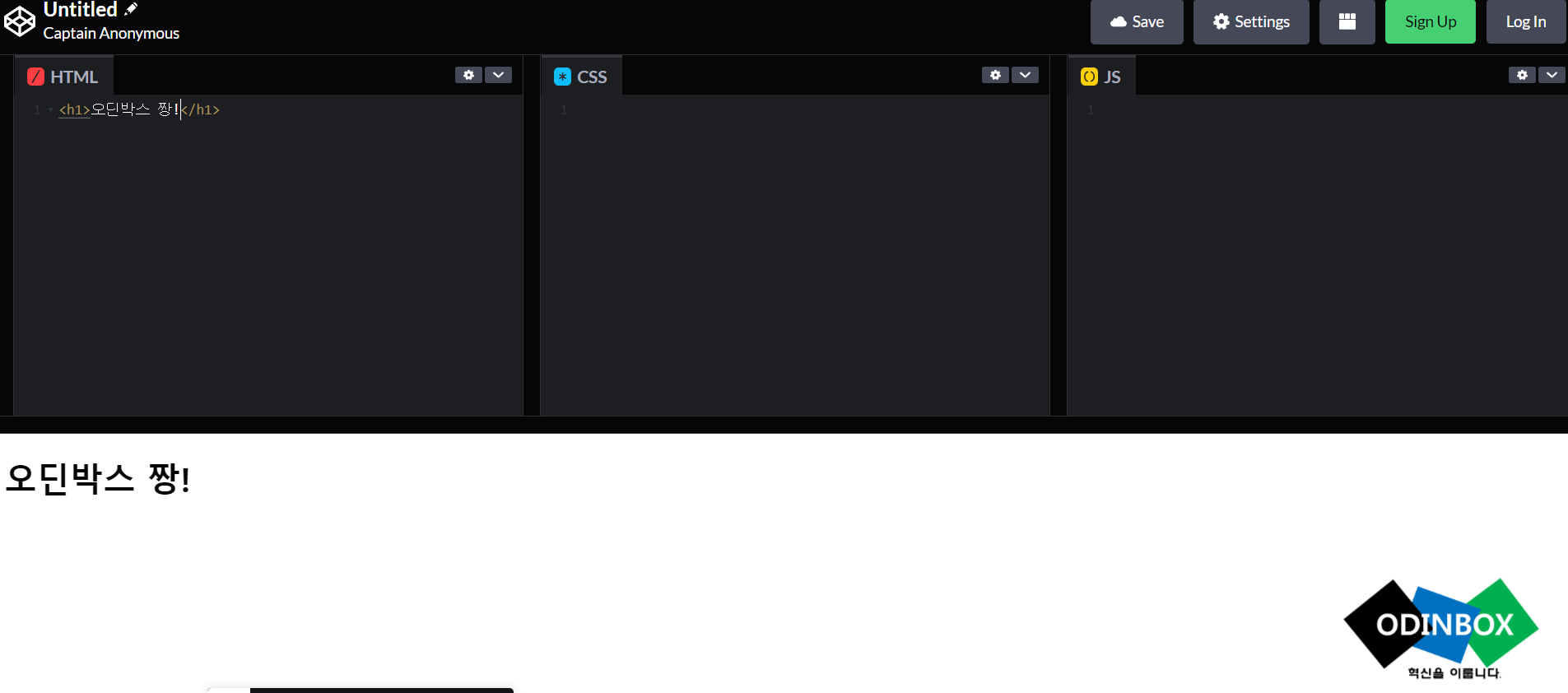 왼쪽 부분에 소스코드를 입력할 수 있는 부분과 오른쪽 해당 코드를 실행한 모습을 바로 볼 수 있도록 되어있습니다.