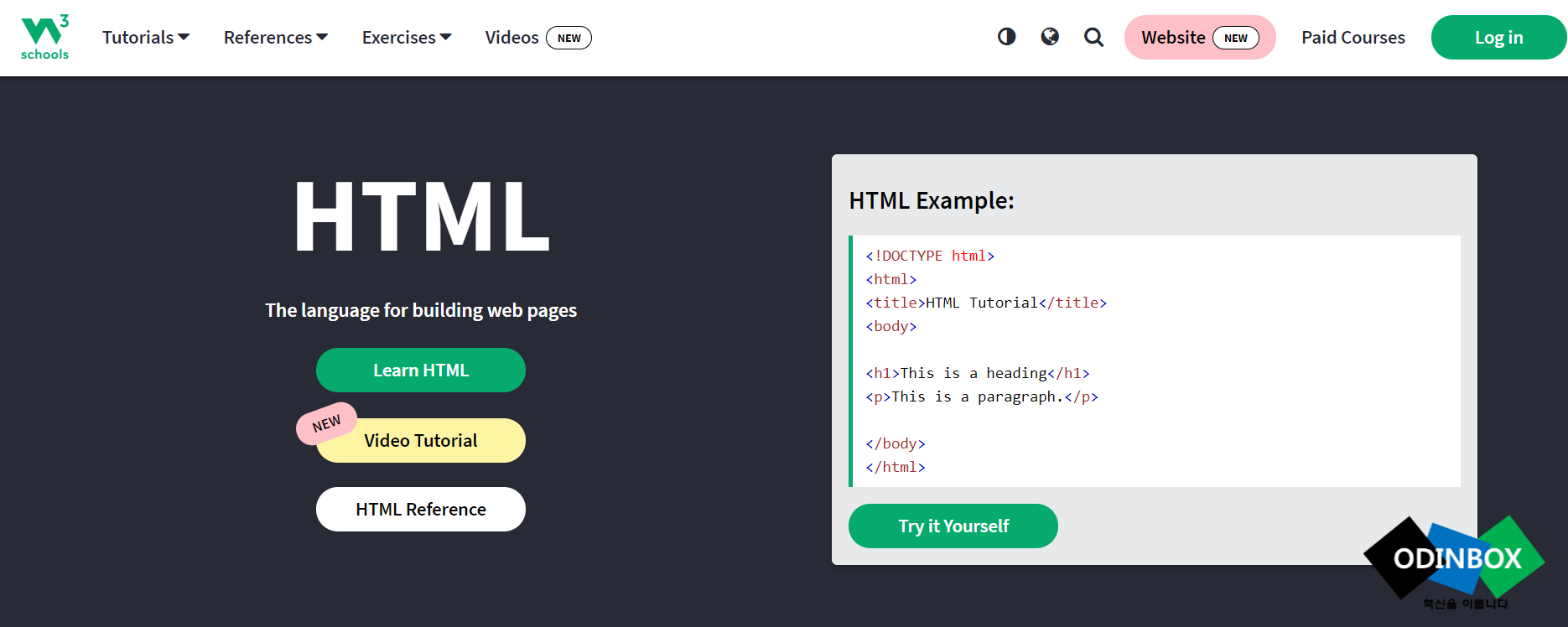 홈페이지에 접속을 하게 되면 제일 먼저 보이는 것은 HTML이 보입니다. 화면에서 오른쪽에 HTML Example 밑에 보면 Try it Yourself를 누르게 되면 HTML 관련하여 테스트할 수 있습니다. 메인 화면에서 스크롤하여 내리게 되면 HTML, CSS, JavaScript, Python, SQL 등을 테스트할 수 있습니다. 다만 아쉽게도 코드펜과 다르게 HTML/CSS/JS 등을 한 번에 테스트는 할 수 없습니다.
