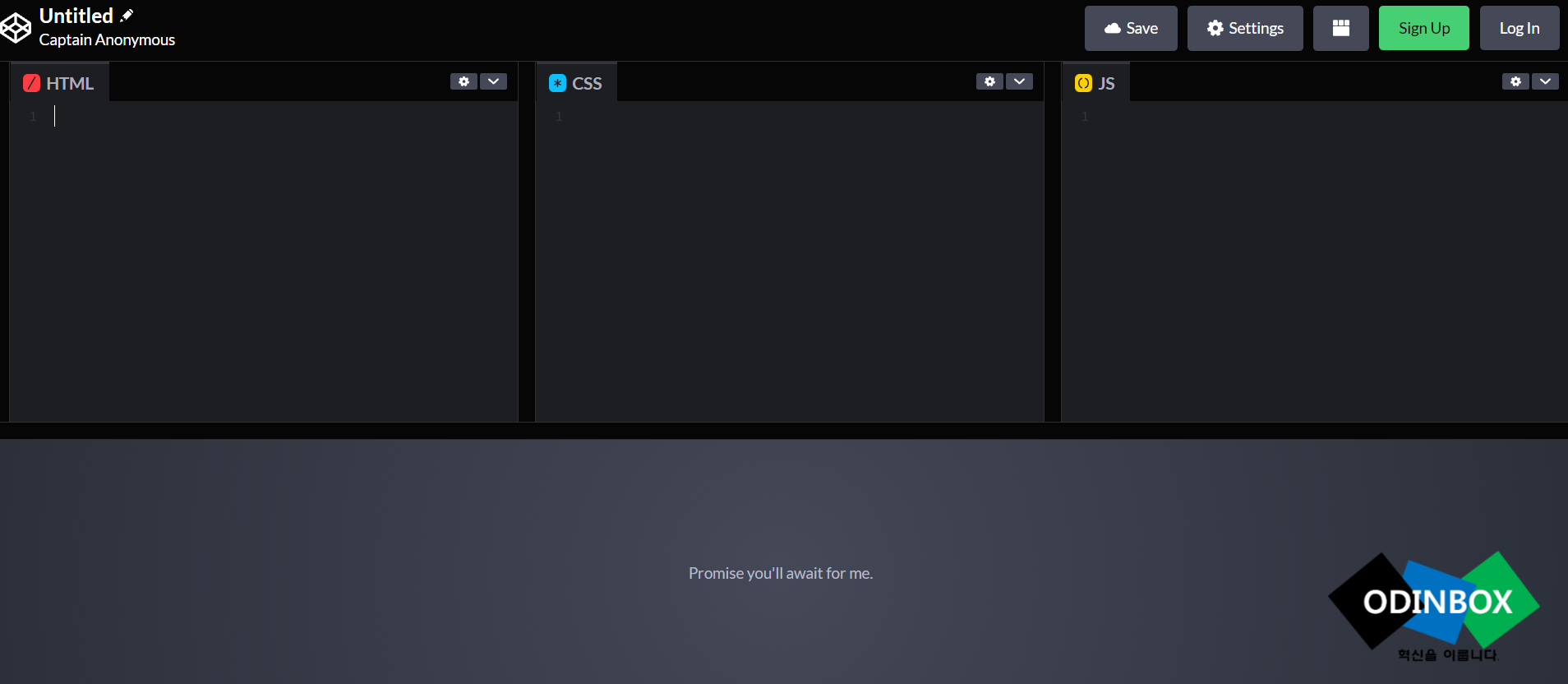 HTML/CSS/JS 영역으로 각각 나눠져 있고 아래 부분은 결과(테스트)를 바로 볼 수 있도록 만들어져 있습니다. 그리고 각각 HTML/CSS/JS의 톱니바퀴 모양을 누르면 일부 설정이 가능합니다.