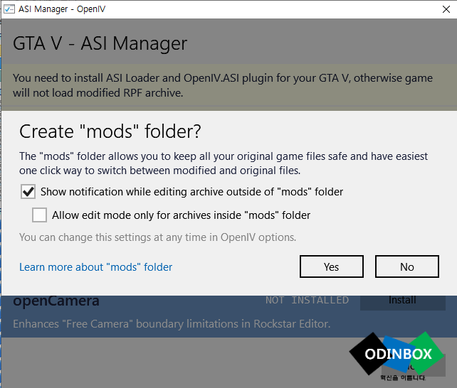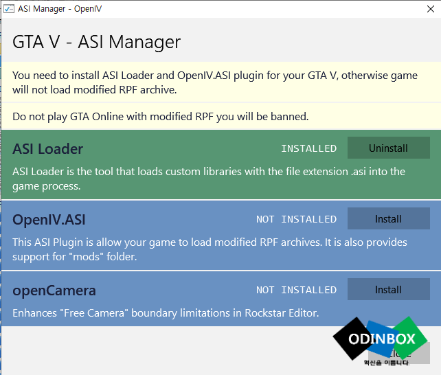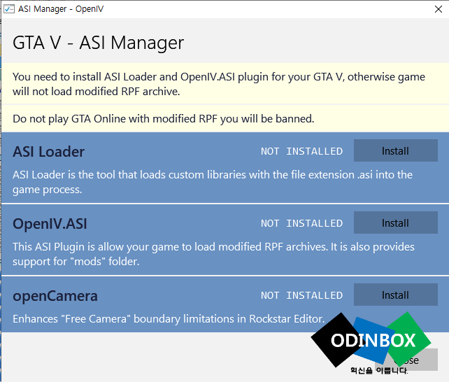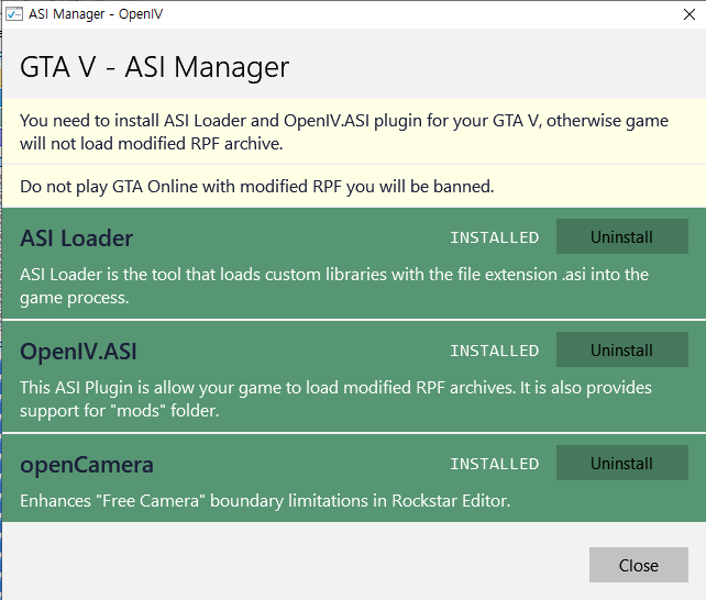 해당 준비물을 준비하기 위해 사이트[#] 접속을 합니다. 그리고, 홈페이지에 있는 초록색 버튼 Download now openiv를 누르면 설치 파일을 다운로드할 수 있습니다. 그리고 본인이 알기 쉬운 곳에 저장을 한 뒤 실행합니다. 영어와 러시아어를 제공하고 있는데 영어를 선택하고 Continue를 누릅니다. 잠시 기다리면 소프트웨어 라이선스 관련하여 동의를 하는지 물어보는데 I accept the terms of this agreemen를 체크하고 Continue를 누릅니다. 그리고, 설치 경로를 설정하는 것이 있는 저의 경우 기본 설치되는 경로에 설치를 진행하려고 합니다. 또한 바탕화면에 아이콘 추가와 함께 Continue를 누릅니다. 그리고 예(Y)를 누르고 잠시만 기다리면 설치가 완료가 됩니다. 그리고 Openiv를 실행하고 Grand Theft Auto V를 누릅니다. 그리고 Grand Theft Auto V locations에서 GTA5를 설치한 경로를 선택하여 설정하면 Continue를 누른 후 다음으로 넘어갈 수 있습니다. 그리고 한번 더 Continue를 누릅니다. 잠시 기다리면 정상적으로 프로그램이 실행된 것을 확인할 수 있습니다. 아직 몇 가지 절차가 더 있습니다. 상단 메뉴 부분에서 Tools를 누르고 ASI Manager를 실행합니다. 첫 번째로 있는 ASI Loader를 Install을 누릅니다. 그리고 Openiv.ASI를 Install을 누르면 mods 폴더를 생성하겠냐는 안내 창이 나오게 됩니다. Yes를 누르면 설치가 완료가 됩니다. openCamera를 설치를 마지막으로 하면 됩니다. 여기까지 그대로 따라오셨다면 90% 설치는 다 했다고 생각하면 됩니다.