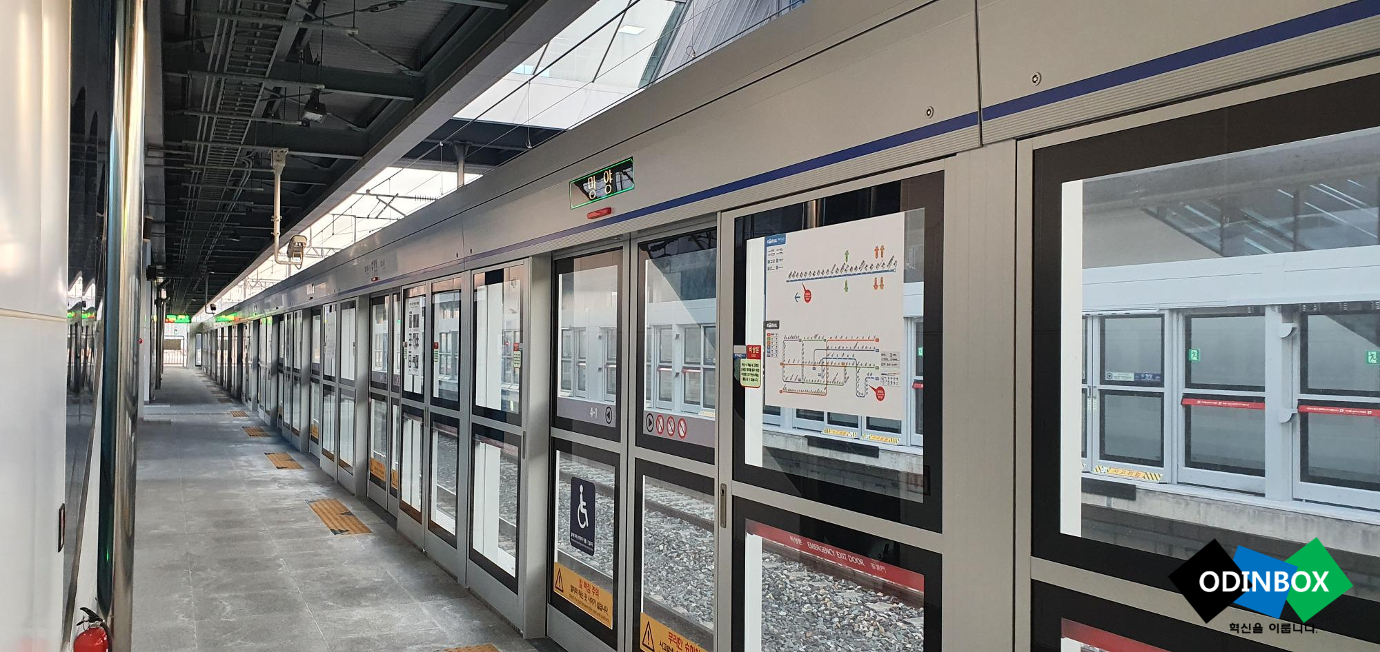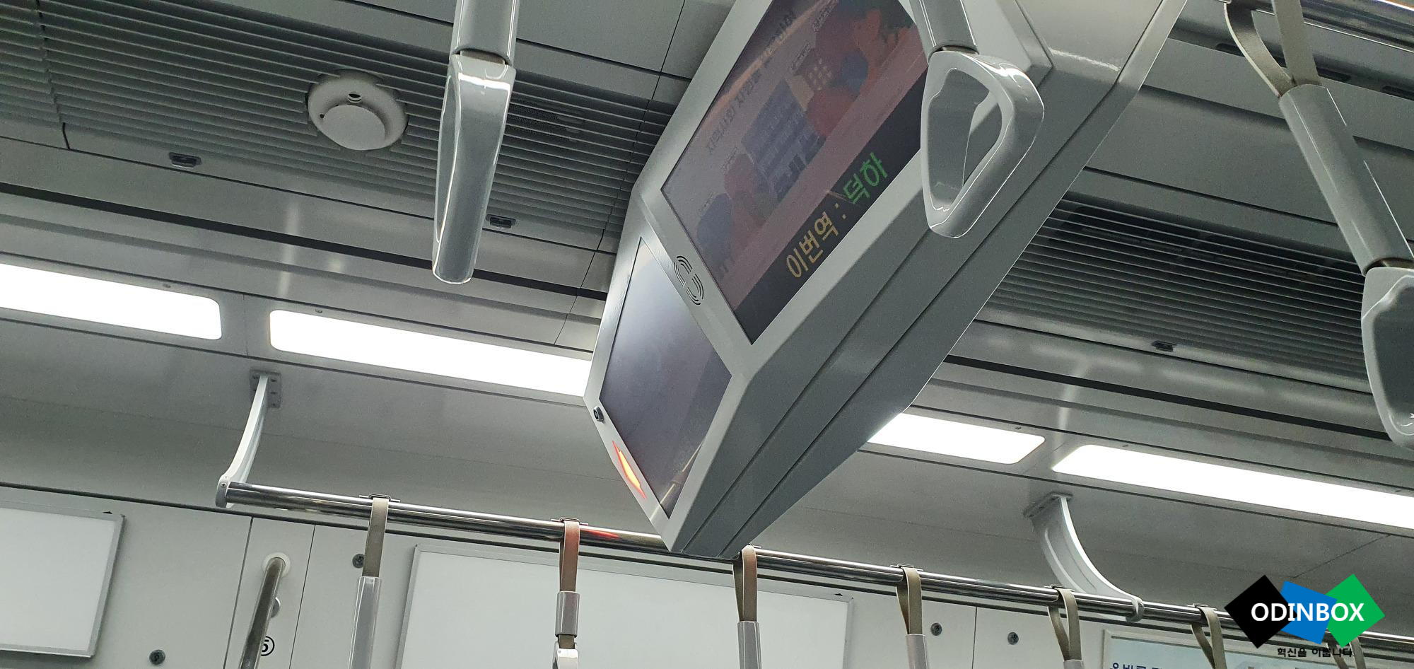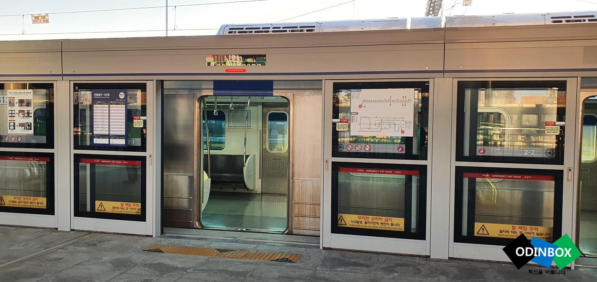 전동차 안 모습입니다. 아직 광고는 없는 모습입니다. 역 도착을 안내하는 화면 또한 크게 볼 수 있고 내리는 위치를 화살표를 통해 알 수 있어 더욱 편리합니다.