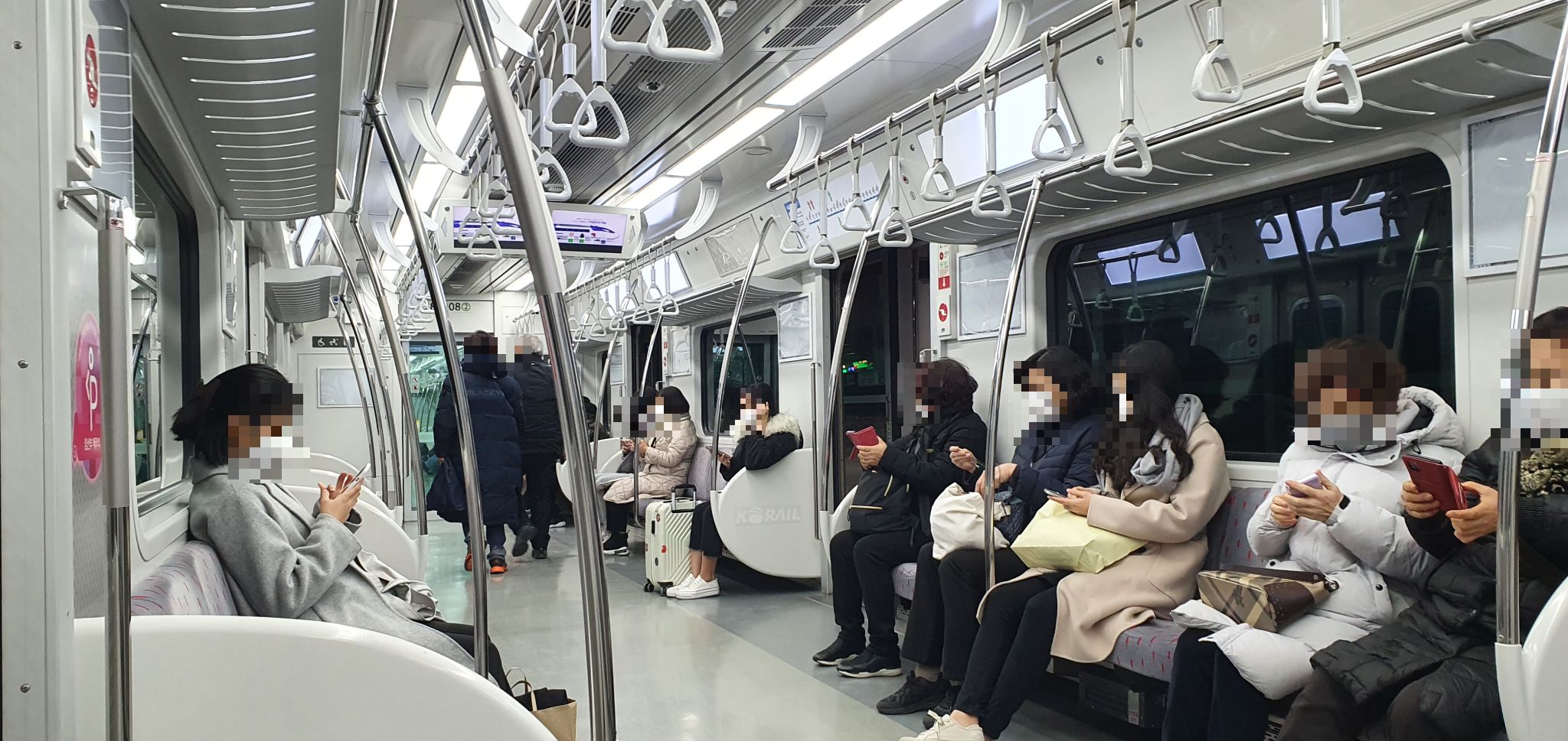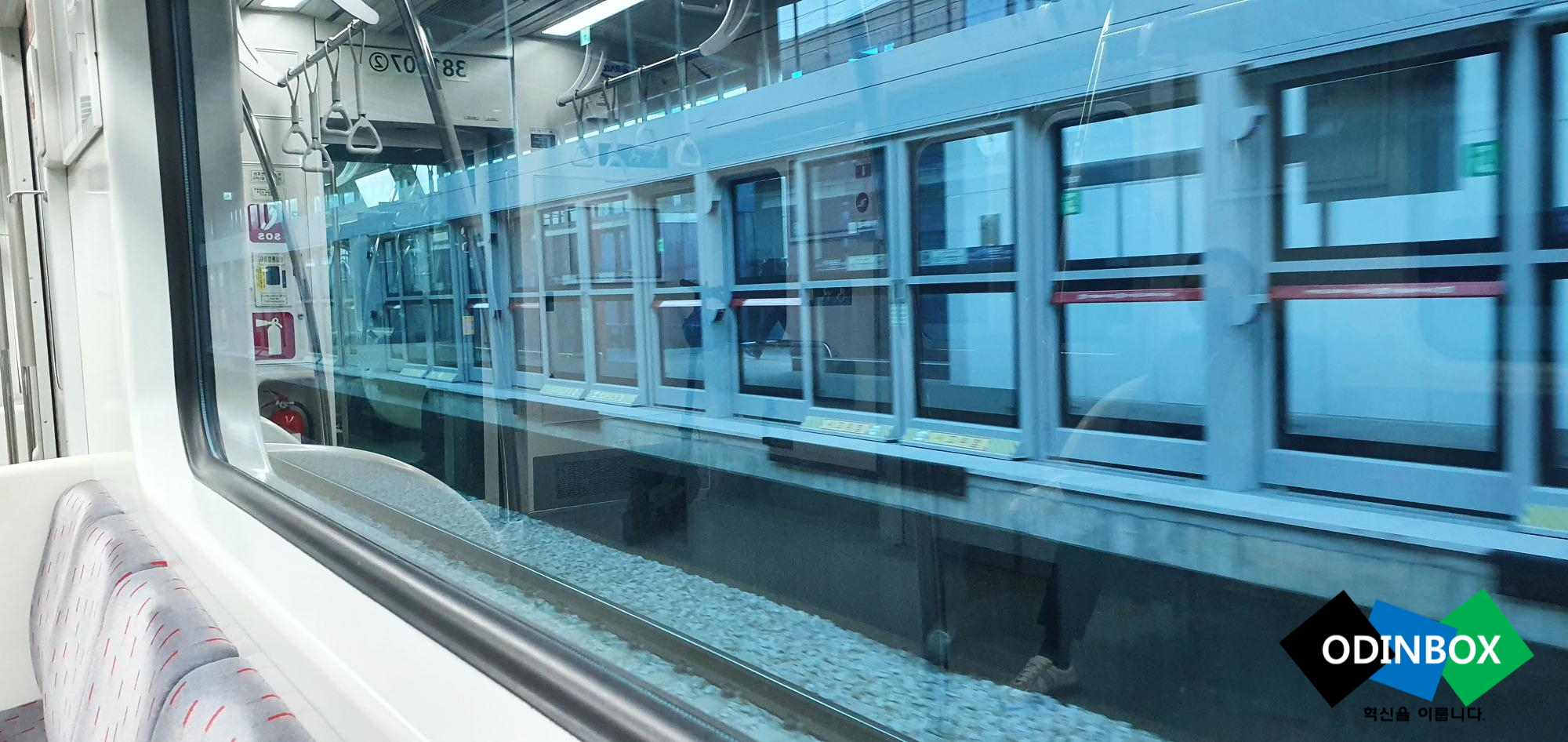 전동차 안 모습입니다. 아직 광고는 없는 모습입니다. 역 도착을 안내하는 화면 또한 크게 볼 수 있고 내리는 위치를 화살표를 통해 알 수 있어 더욱 편리합니다.