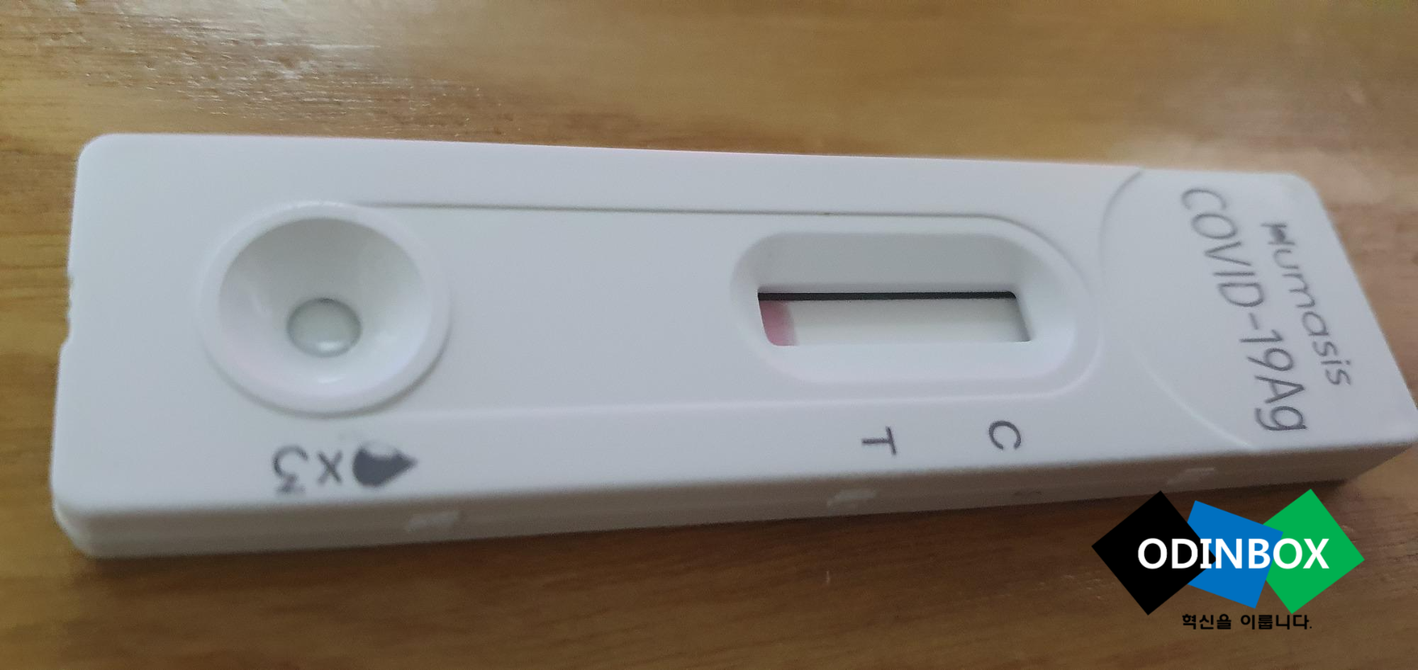 C 부분은 항상 빨간 줄이 있어야 합니다. 정상적인 디바이스(본체)는 사진 속 모습처럼 빨간 줄을 볼 수 있습니다. 그러나 만약 C부분에 빨간 줄이 없다면 해당 디바이스가 문제일 수 있기 때문에 새로 구하셔서 다시 하시는 것을 추천합니다. 만약 본인이 코로나 양성인 경우 C와 T에 줄이 생깁니다. 음성인 경우 C에만 빨간 줄이 나오게 됩니다. 희미하게 T부분에 빨간 줄이 생기게 된다면 따로 보관 후 임시선별검사소에서 의료진 판단하에 PCR 검사를 추천해드립니다.