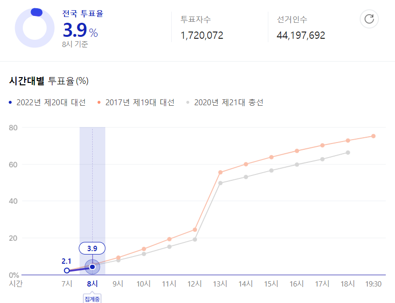 각 포털사이트에 투표율 검색을 하시면 바로 보실 수 있습니다 해당 경로의 경우 [#]를 확인하시면 바로 빠르게 이동을 할 수 있습니다.
