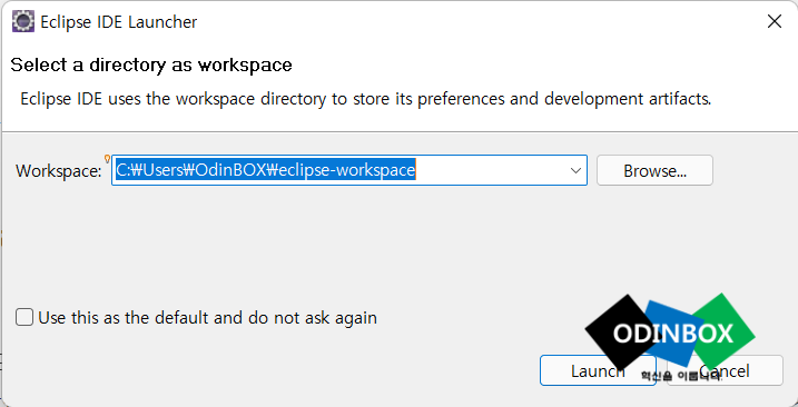 이클립스 버전과 함께 잠시만 기다리면 Eclipse IDE Launcher가 나오게 되는 것을 볼 수 있습니다 해당 설정에서는 이클립스에서 저장되는 폴더(Directory or Workspace)를 설정을 할 수 있습니다. 기본적으로 설정되는 경로는 "C:\Users\사용자명\eclipse-workspace"로 되어있는데 본인이 원하는 경로로 설정을 하고 Launch를 누르면 됩니다 혹시나 계속해서 해당 설정창이 뜨는 것을 보기 싫으시면 하단 부분에 Use this as the default and do not ask ag
