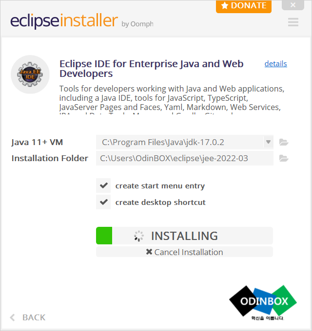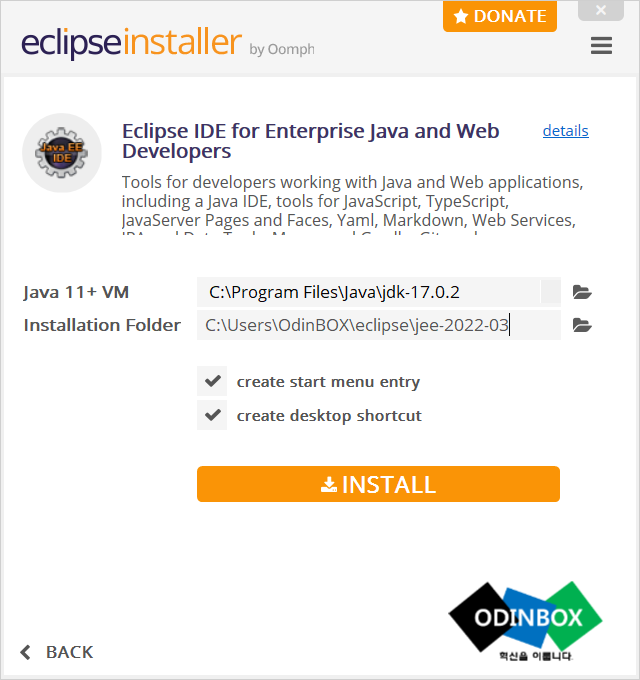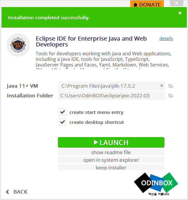 다양한 종류가 있습니다 저의 경우 Eclipse IDE for Enterprise java and Web Developers를 선택하여 설치를 진행합니다. 여러분이 원하시는 종류를 누르셔도 이후 진행은 똑같기 때문에 원하는 것을 선택하시면 됩니다. 그리고 자바 버전 경로와 함께 이클립스 설치 경로를 설정을 하고 INSTALL버튼을 누르고 Accept를 누르면 자동으로 설치가 시작됩니다 그리고 설치가 완료가 되면 LAUNCH버튼을 누르면 이클립스를 바로 실행을 할 수 있습니다.