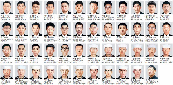 서대호 중사, 차균석 중사, 문영욱 중사, 이창기 준위, 김태석 원사, 정종율 상사, 조정규 중사, 최정환 상사, 이상준 중사, 김동진 중사, 문규석 원사, 박석원 상사, 손수민 중사, 박성균 중사, 민평기 상사, 신선준 상사, 정태준 일병, 임재엽 중사, 장진선 중사, 방일민 중사, 심영빈 중사, 박경수 상사, 남기훈 원사, 강준 상사, 안동엽 병장, 조진영 중사, 이상민 하사, 장철희 일병, 강태민 상병, 강현구 하사, 박보람 중사, 이상민 하사, 조지훈 상병, 김선명 병장, 정범구 병장, 나현민 상병, 박정훈 병장, 이용상 하사, 김선호 병장, 최한권 원사, 김종헌 중사, 김경수 중사, 안경환 중사, 서승원 하사, 이상희 병장, 이재민 병장, (한주호 준위)