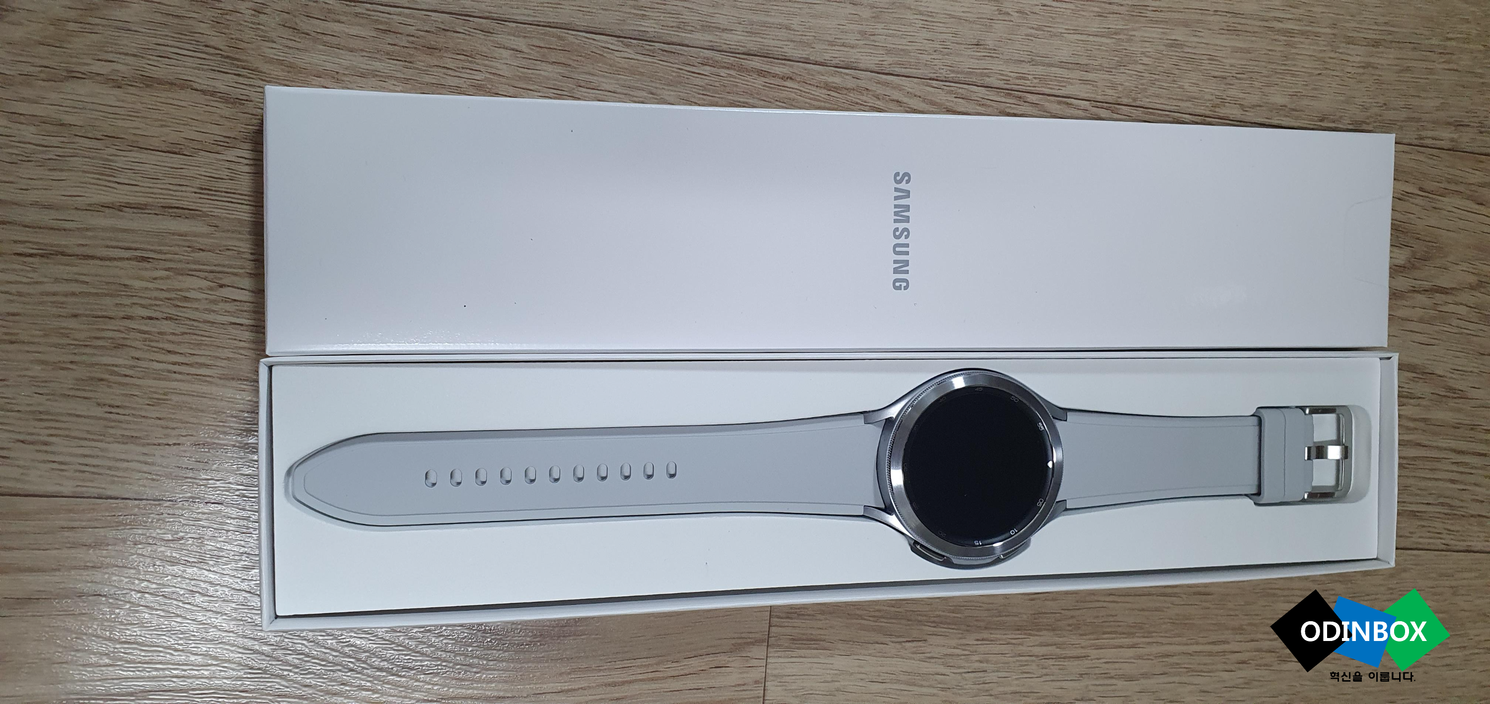 기본 스트랩이 연결이 되어있는 상태로 넣어져 있고 구성품의 경우 갤럭시워치4 클랙식, 무선 충전기, 간단 사용 설명서가 있습니다. 본체의 경우 당연히 문제가 없겠지만 본체를 겉으로 봤을 때 파손이나 흠집이 있는지 확인을 하고 구성품도 확인을 합니다. 색상을 실버와 블랙 중에 어떤 것을 고를까 했는데 역시 실버가 실제로 보니 더 이쁜 것 같습니다. 상품에도 별다른 이상이 없다고 생각이 들면 이제 처음으로 전원을 눌러 워치4를 켜보도록 합니다.