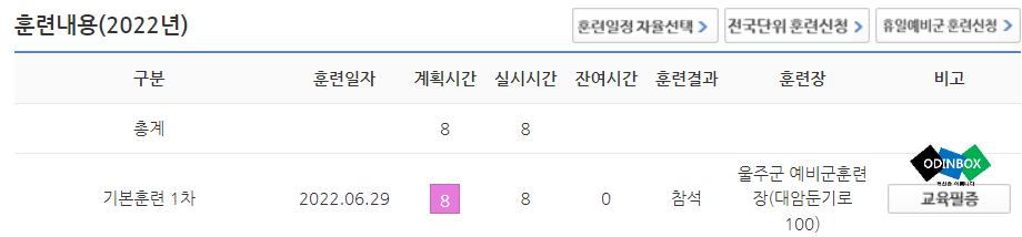 2022년 예비군 훈련시간 : 동원 지정 및 동원 미지정 - 소집훈련 (1일 8시간), 원격교육 1일(8시간)