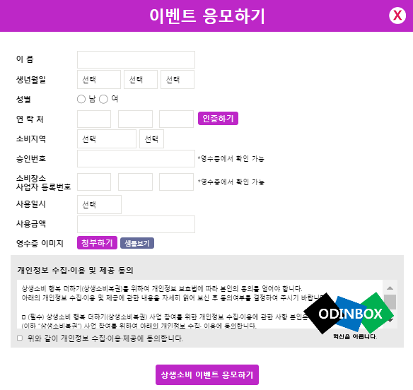 영수증을 촬영한 사진과 함께 이름, 생년월일, 성별, 연락처, 소비지역, 승인번호, 소비장소 사업자 등록번호, 사용일시, 사용금액을 입력하고 개인정보 수집/이용 제공 동의를 하고 상생소비 이벤트 응모하기를 누르게 되면 정상적으로 신청을 할 수 있습니다.