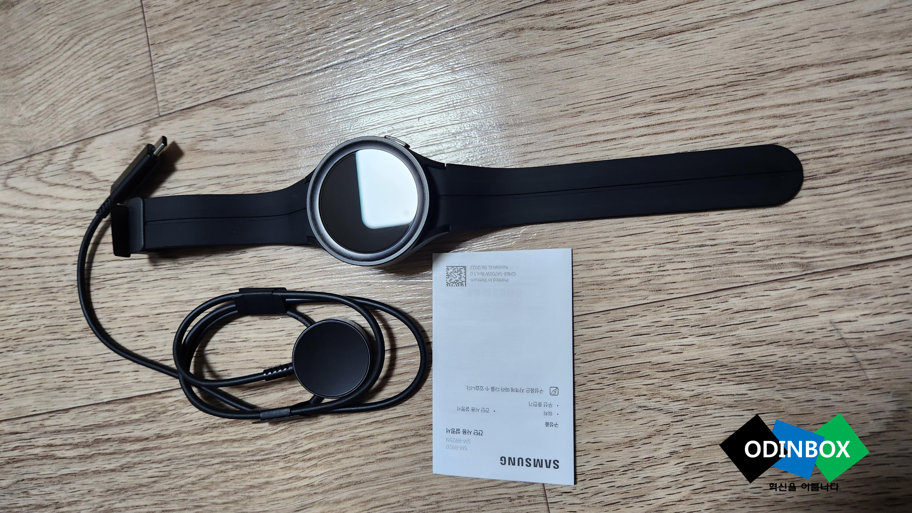 갤럭시워치5 구성품은 워치4와 동일하게 제품 설명서와 기본 스트랩 포함과 함께 본체, 충전기 선이 있습니다 베젤이 돌리는 것이 사라져서 밋밋할 것 같았는데 실제로 보면 괜찮긴 합니다. 그리고 나름 그 느낌을 살리고 싶었는데 약간 올라가져 있어 그 부분 쪽을 활용하면 될 것 같았습니다.
