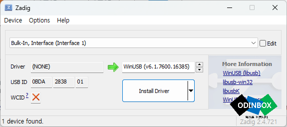 Zadig 파일을 실행을 하면 위와 같이 실행이 되는데, Bulk-In, Interface (Interface 1) * 컴퓨터마다 다를 수 있습니다만 이름이 비슷하면 선택을 하고  Install Driver를 설치하면 설치가 자동적으로 되고 설치가 완료되었는다는 안내 창이 되면 정상적으로 이용을 할 수 있는 준비가 되었습니다.