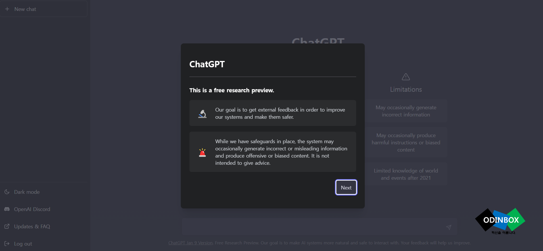설정을 다하고 간단한 안내사항을 확인을 하고 Next를 누르게 되면 ChatGPT를 사용 할 준비는 끝입니다. 이제 한번 이용을 해도록 하겠습니다.