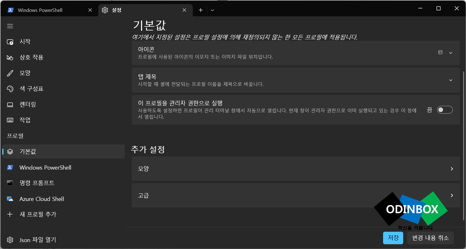 아까와 같이 Windows Terminal에서 상단 버튼을 누르고 설정에 들어와 왼쪽 메뉴 중 Json 파일 열기를 누릅니다. 그리고 아까 복사했던 것을 schemes라는 곳에 복사한 내용을 추가를 합니다. 그리고 profiles의 defaults 안에 있는 colorScheme에 테마이름을 적용을 하면 적용을 하기 위해 설정은 모두 끝났습니다. 그리고 아까 설정화면에서 왼쪽 메뉴에서 모양을 누르면 아까 설정했던 테마 이름으로 적용을 할 수 있습니다. 이렇게 되면 모든 설정은 다 끝났습니다.
