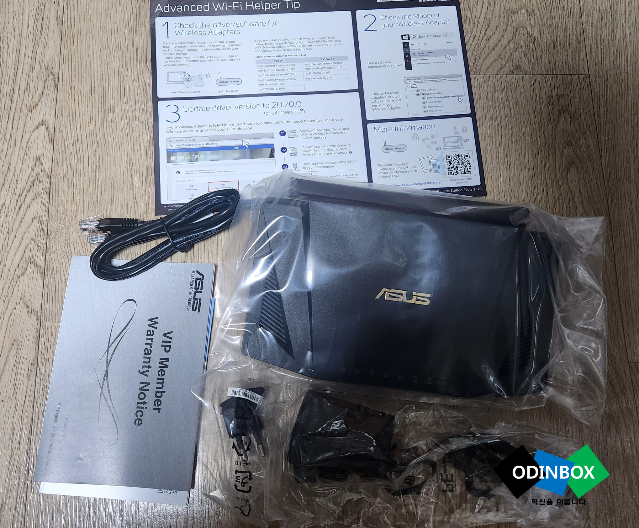 박스를 열고 보면 사용설명서와 함께 제품보증서 그리고 제품과 함께 전원 어댑터, 랜선 케이블이 같이 있습니다.
