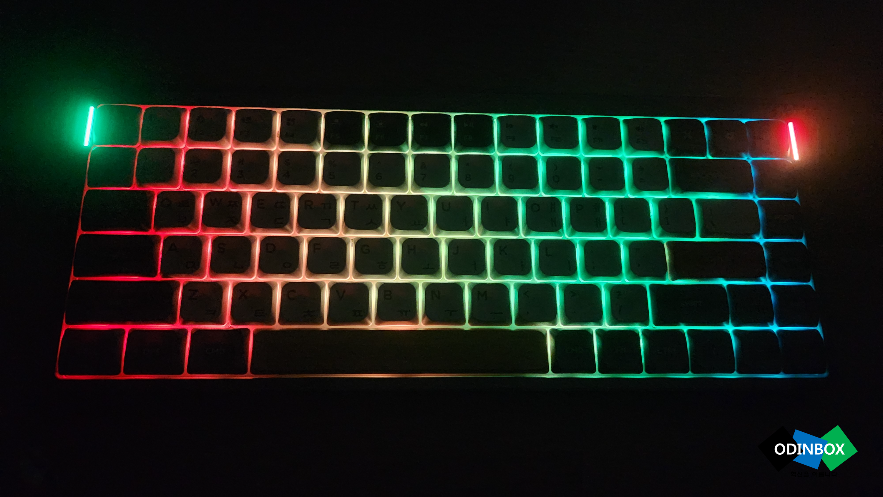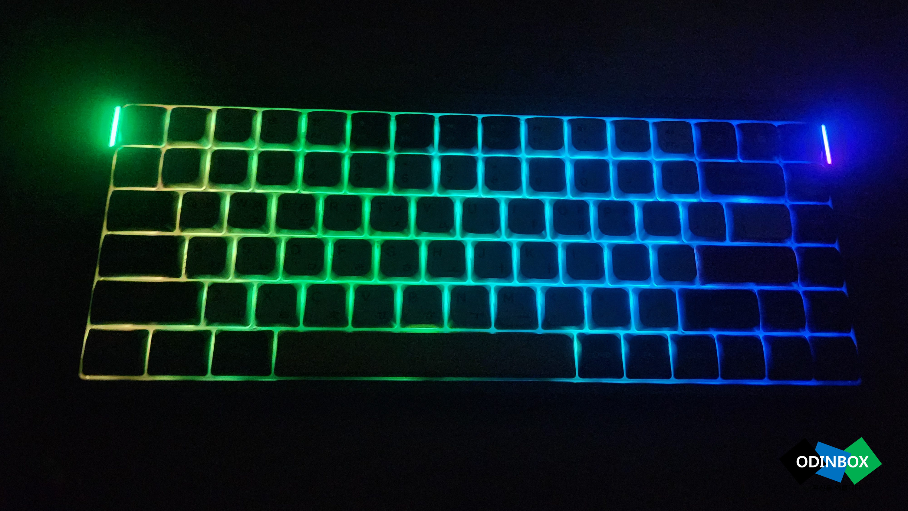 RGB도 지원을 하고 있습니다. 사진과 다르게 실제로 보면 그렇게 과하게 색상이 보이진 않아 부담스럽진 않습니다 그러나 조금 아쉬운 부분이 있다면 타건하는 키 중심으로 RGB가 되는 것이 아닌 그 주위로 타건하는 곳이 RGB가 나와 그 부분이 사람에 따라 아쉽다고 느껴질 수 있다고 생각을 했습니다.