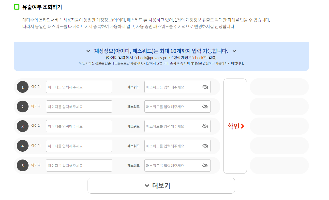 2차 인증을 완료하고 계정정보를 입력하고 확인을 누르게 되면 해당 정보를 확인을 하여 유출여부를 바로 오른쪽에서 확인을 할 수 있도록 나오게 됩니다.
