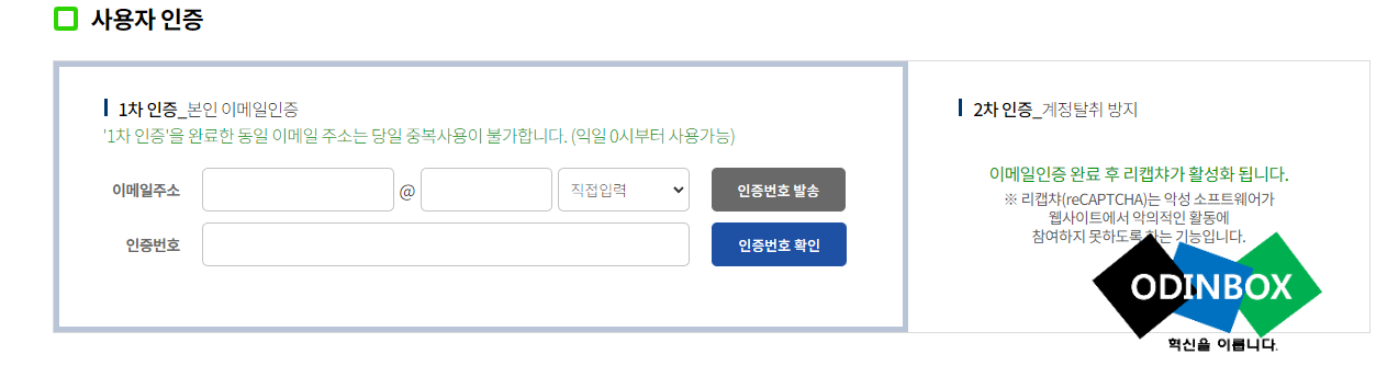 상단 메뉴에 있는 유출여부 조회하기를 누르고 유의사항 및 안내를 한번 보시고 하단 부분에 차례대로 개인정보 수집/이용 동의에 동의를 선택하고 하단 부분에 1차 인증으로 사용장 인증을 해야 하는데 바로 본인 이메일을 인증을 하고 2차 인증의 경우 계정 탈취 방지를 통한 이메일 인증을 완료하면 리캡챠라는 보안을 한번 더 진행을 하게 됩니다.