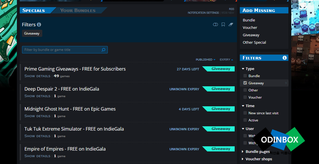 IsThereAnyDeal 메인화면에서 All Specials를 클릭하고 우측 부분에 Giveaway를 선택 후 보게 되면 기간한정하여 잠시 풀리게 된 전세계의 게임을 한눈에 볼 수 있도록 정리가 되어 나옵니다.