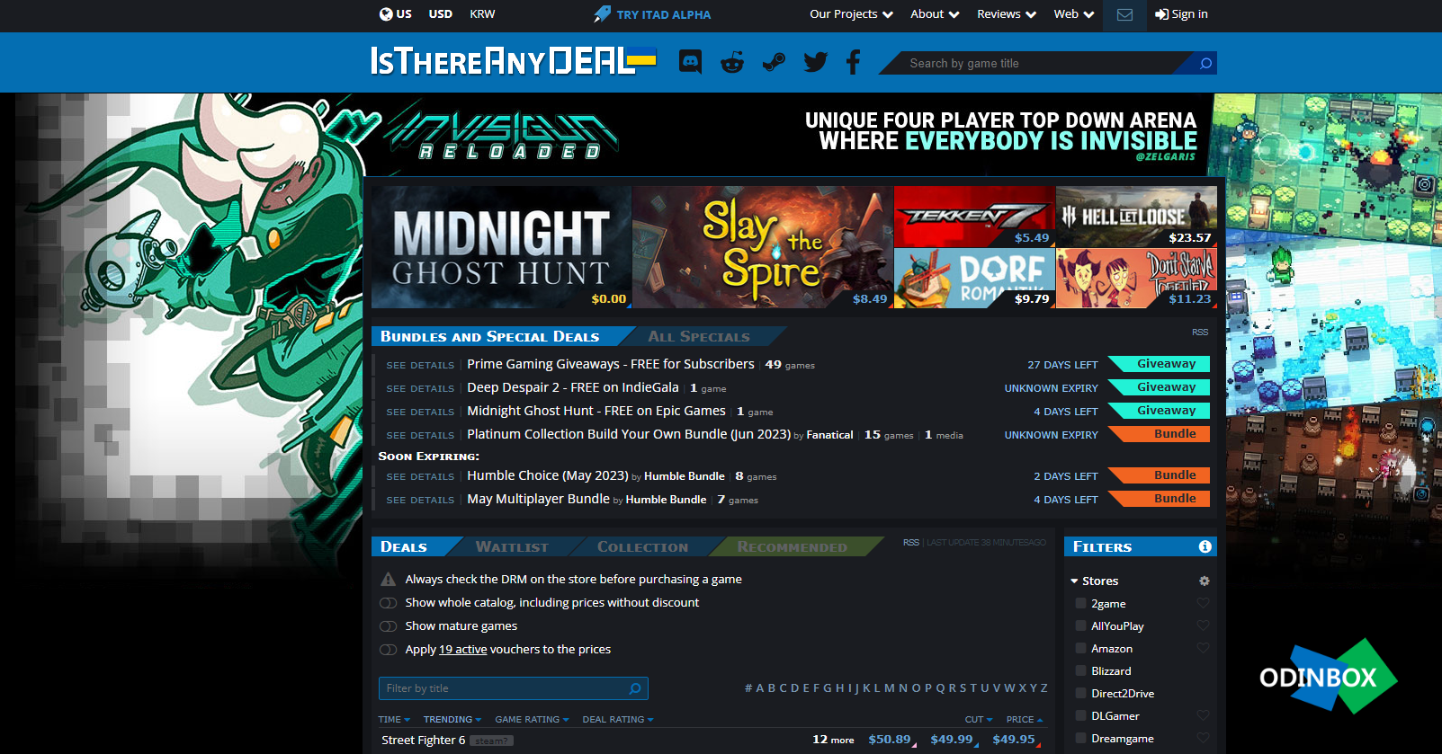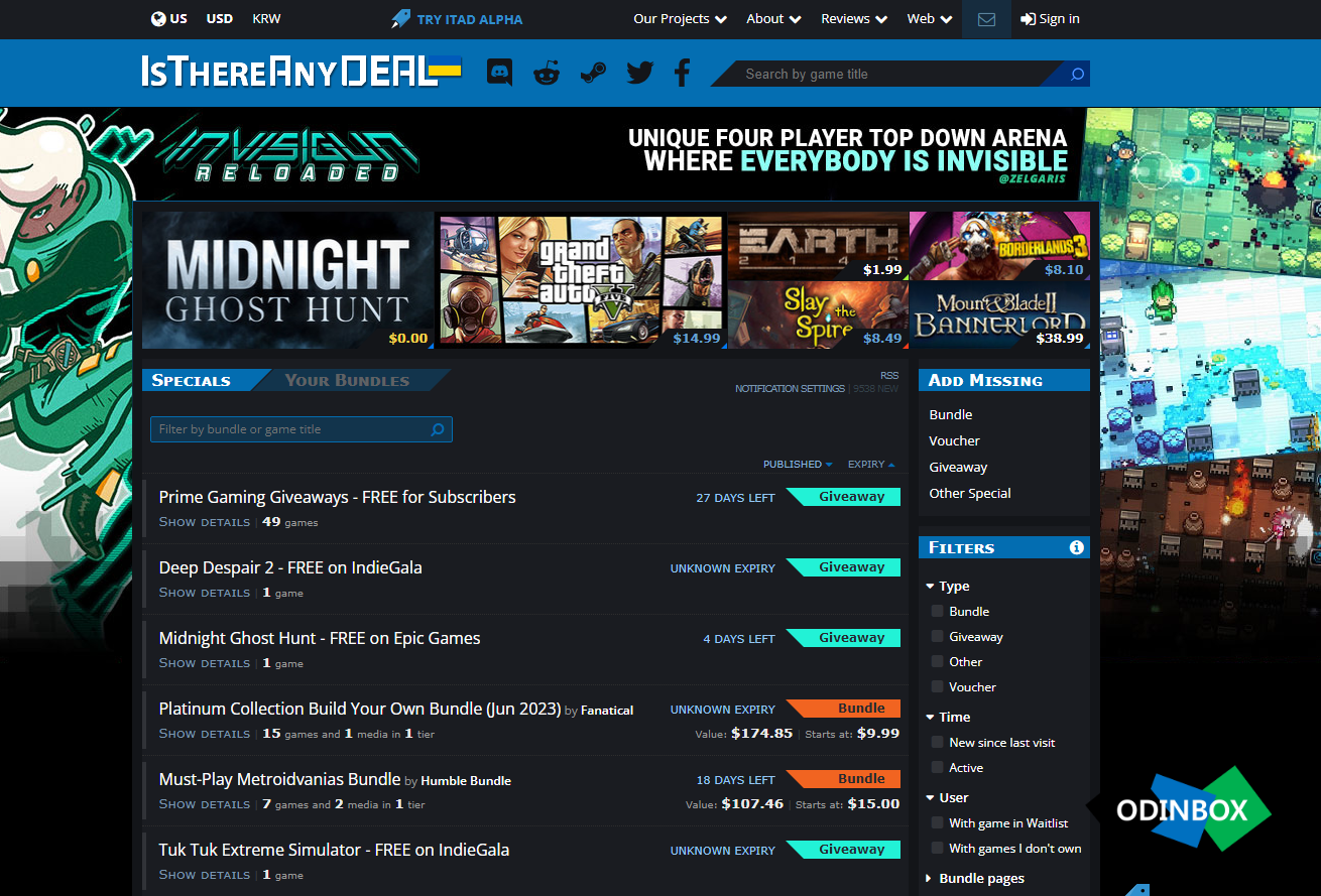 IsThereAnyDeal 메인화면에서 All Specials를 클릭하고 우측 부분에 Giveaway를 선택 후 보게 되면 기간한정하여 잠시 풀리게 된 전세계의 게임을 한눈에 볼 수 있도록 정리가 되어 나옵니다.