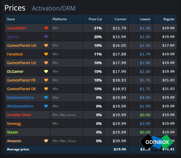 스팀에서 자신이 가지고 싶은 게임의 이름을 그대로 복사하여 IsThereAnyDeal에 검색을 합니다 그리고 원하는 게임을 선택하게 되면 화면에 할인이 되어 살 수 있는 가격에 대해서 나와 있습니다.