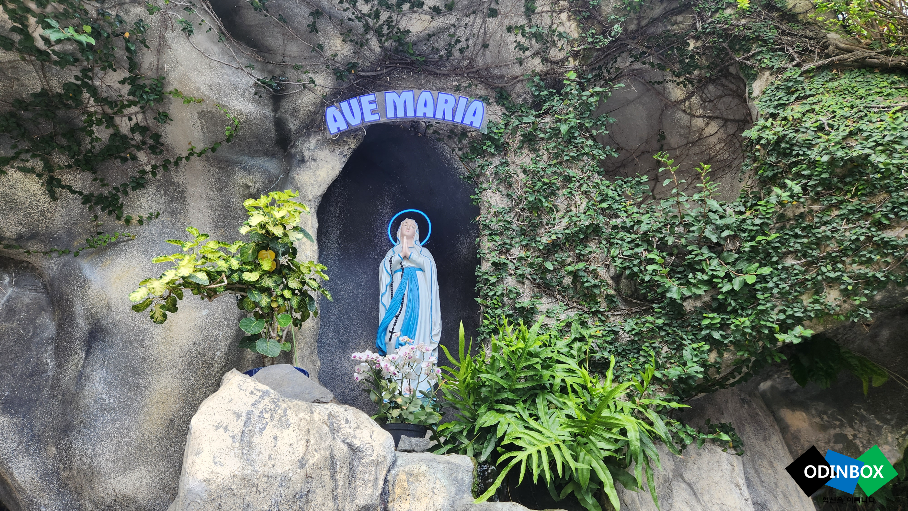 It's a cathedral located in Danang. What's fascinating about this place is that it's a unique church in pink with a typical Western appearance, and there's a saying that it was originally going to be red, but it was pink due to a lack of paint. And if you look at the top, it's shaped like a chicken. As I mentioned earlier, Vietnam had a French colonial period and it was built in 1925. And if you look to the side, you see the holy water flowing with the statue of Mary.