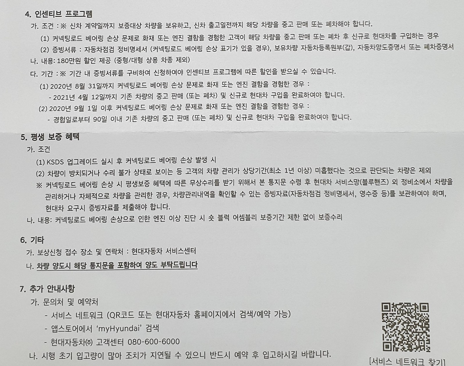 해당 업그레이드를 한 차량의 경우 무상수리를 진행을 할 수 있는데 물론 아무나 다 할 수 있는 것은 아니고 해당 업그레이드를 진행을 했고 엔진경고등이 점등된 상태에서 차량 엔진 확인을 했는데 코드가 노크신호이상(P132600)이라는 것이 뜨는 순간 차량을 입고를 하게 되면 엔진 교체(전부 교체는 아님 일부)가 이루어지게 됩니다.
