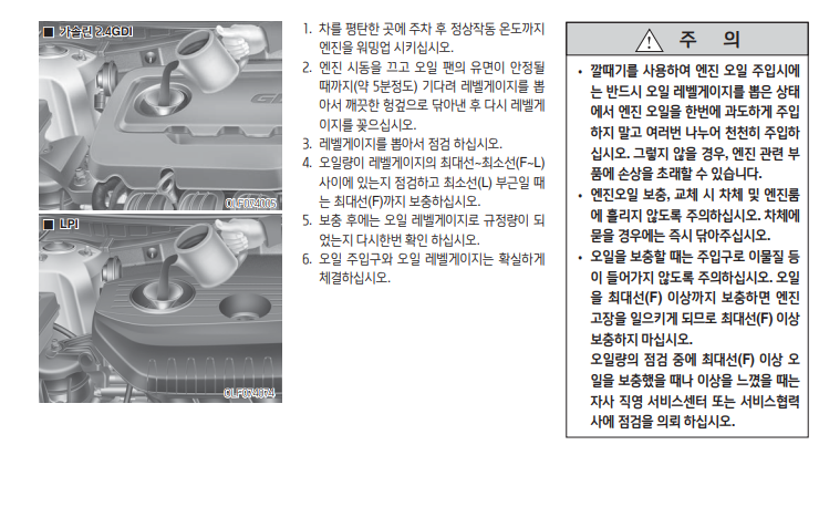 잠시 대기 후 8시 40분쯤 휴대폰으로 전화가 왔습니다. 정비를 하기 전 확인을 할 것이 있으니 차량이 있는 곳으로 오라는 말 과 함께 이동을 합니다. 증상을 우선 설명을 했습니다. 문제는 총 세 가지였습니다. 첫 번째, 오일감소 문제와 두 번째, 냉간시동 시 소음 그리고 마지막으로 세차 중 시동 꺼짐 현상을 문의를 했습니다. 해당 문제를 자세히 확인한다는 말과 함께 차량에 대한 간단한 정보를 물어봅니다. 우선 해당차량의 정비 내역의 경우 블루핸즈 정비 내역을 통해서 알 수 있지만 추가적으로 다른 곳에서 진행을 했던 것이 있는 확인을 하고 고객쉼터에 잠시 기다렸습니다. 약 1~2시간 후 다시 전화가 와서 방문을 했지만 결과 적으로 이야기한다면 이상이 없다는 것입니다. 또한 KSDS업그레이드를 진행한 차량은 P132600이 발현이 되면 무상교체를 할 수 있는지를 확인을 하니 안된다는 말을 하는데 여기서 사실 당황했습니다 또한 L보다 조금 더 아래에 찍혀도 엔진오일이 있어 큰 문제가 없다는 말을 하는데 여기서도 한번 황당함의 표정이 나왔습니다. 자신들의 매뉴얼에도 F-L사이를 유지해야 한다는 말이 있는데 L보다 아래에 있어도 오일이 있어 괜찮다는 말을 하다니요... 이런저런 이야기를 했지만 결국 답변은 우리가 할 수 있는 것이 없다는 말이었습니다. 사실 여기를 오면서 생각을 했지만 사실상 안될 것이라고 예감을 했지만 결국 정말 안되긴 했습니다.