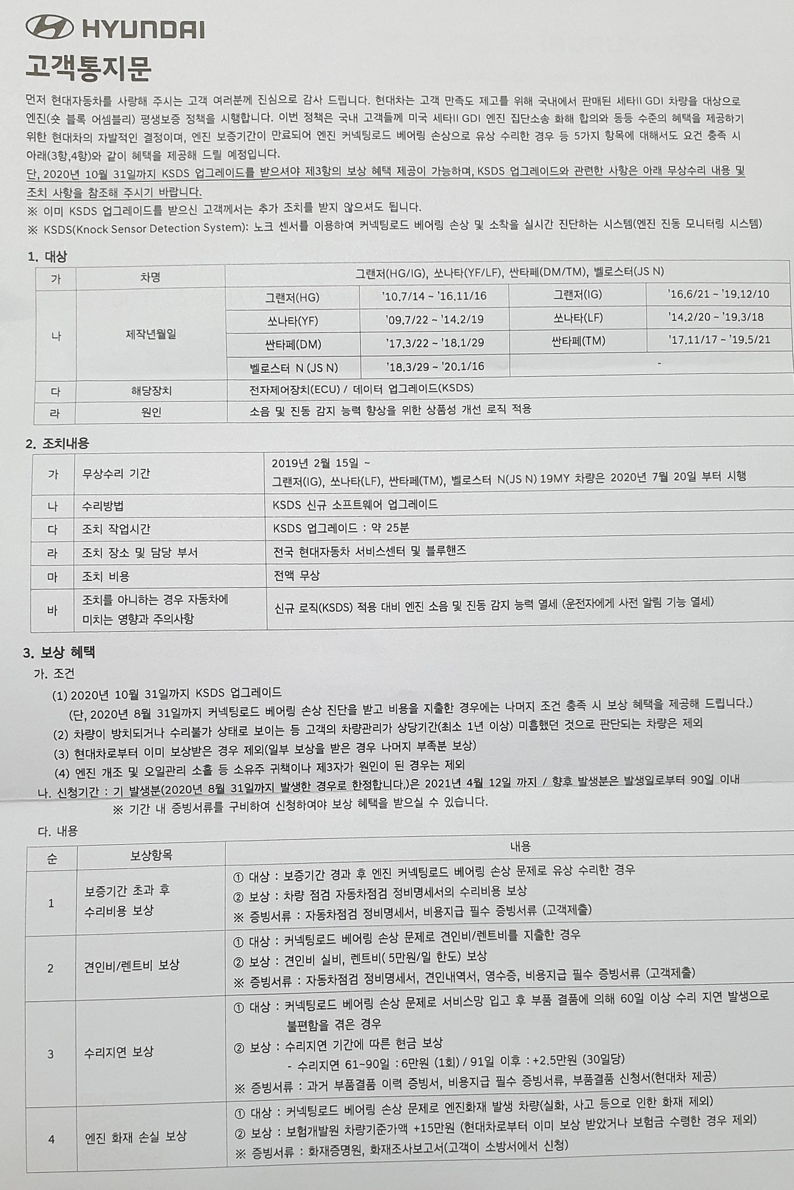 | 신규 로직(KSDS) 적용 대비 엔진 소음 및 진동 감지 능력 열세 (운전자에게 사전 알림 기능 열세)에 따른 무상수리 <*대상차량별 생산일자> 그랜저(HG): 2010.07.14~2016.11.16 그랜저(IG): 2016.06.21~2018.05.09 쏘나타(YF): 2009.07.22~2014.02.19 쏘나타(LF): 2014.02.20~2018.03.15 싼타페(DM): 2017.03.22~ 2018.01.29 <*세타II GDI 차량을 대상으로 엔진(숏 블록 어셈블리) 평생보증 정책을 시행함에 따른 무상수리이며, 엔진 보증기간이 만료되어 엔진 커넥팅로드 베어링 손상으로 유상 수리한 경우 등 5가지 항목에 대해서도 요건 충족 시 보상 혜택이 제공 될 예정이므로 보상 조건, 항목, 혜택 등에 대한 자세한 내용에 대해서는 제작사 고객센터로 문의주시기 바랍니다. / 단, 2020년 10월 31일까지 KSDS 업그레이드를 받으셔야 보상 혜택 제공이 가능하오니 참조해 주시기 바랍니다,> 출처 : 자동차리콜센터 中 |