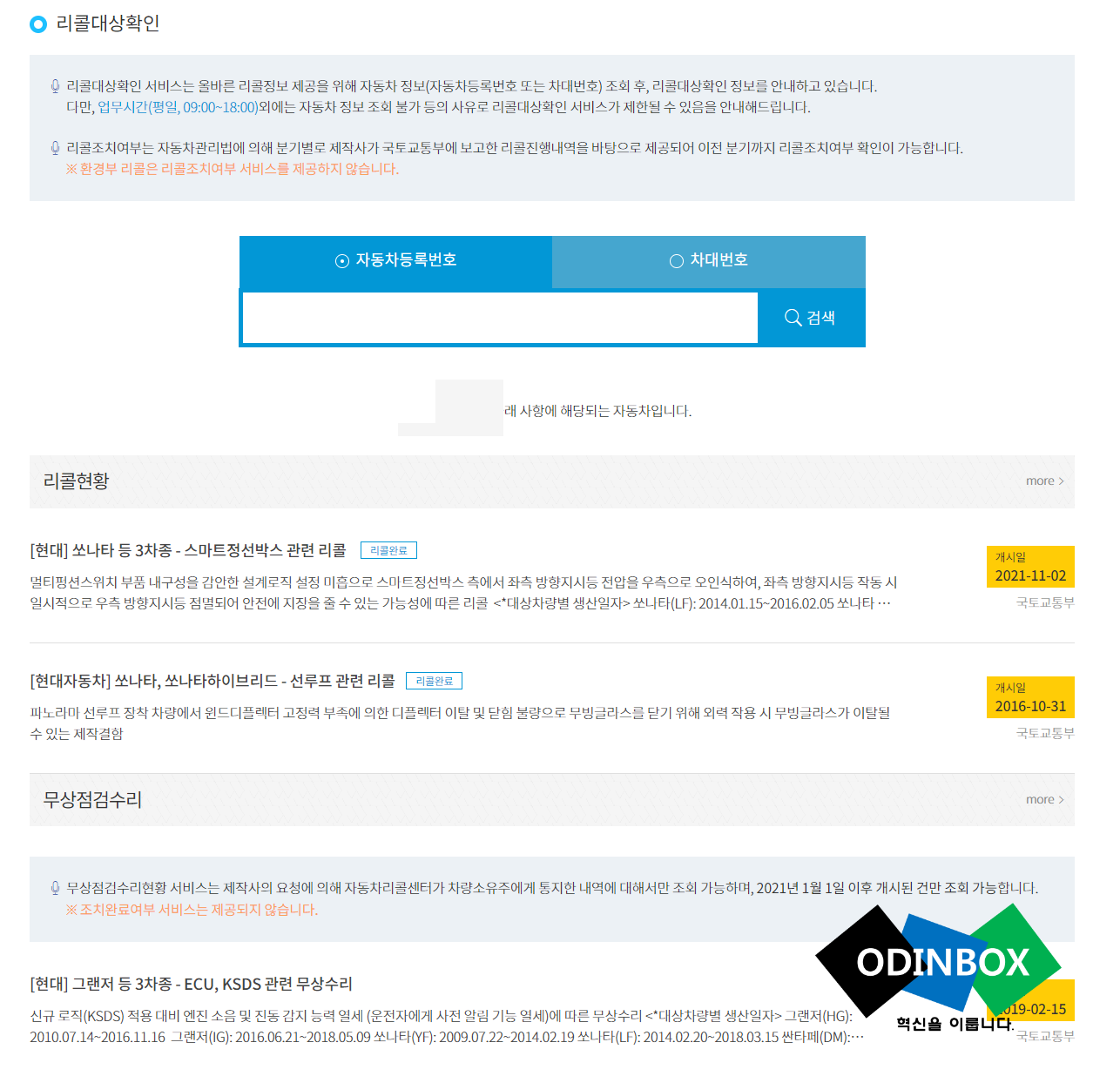 자동차리콜센터[#]로 접속을 합니다. 메인화면 아래에서 확인을 하시면 알 수 있듯이 자동차등록번호(차량번호)를 통해서 바로 조회를 할 수 있고 차대번호로 조회를 할 수 있습니다.