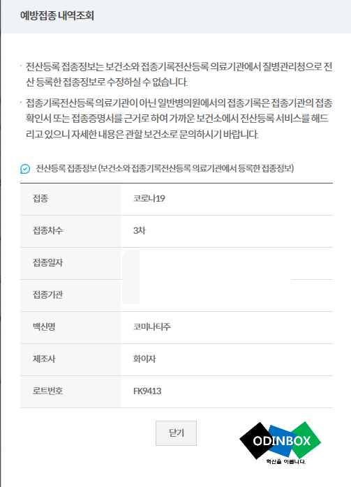 그리고 예방접종 내역조회 화면을 보게 되면 내가 맞은 백신이 어떤 것인지 확인을 할 수 있도록 조회를 할 수 있습니다. 저의 경우 코로나 백신을 3차까지 접종을 했으며 이번에 알아보고 싶은 것은 예를 들어 3차 백신의 로트번호를 알려면 해당 아이콘을 선택을 하면 백신의 정보와 함께 내가 맞은 곳의 접종 정보도 확인을 할 수 있습니다.