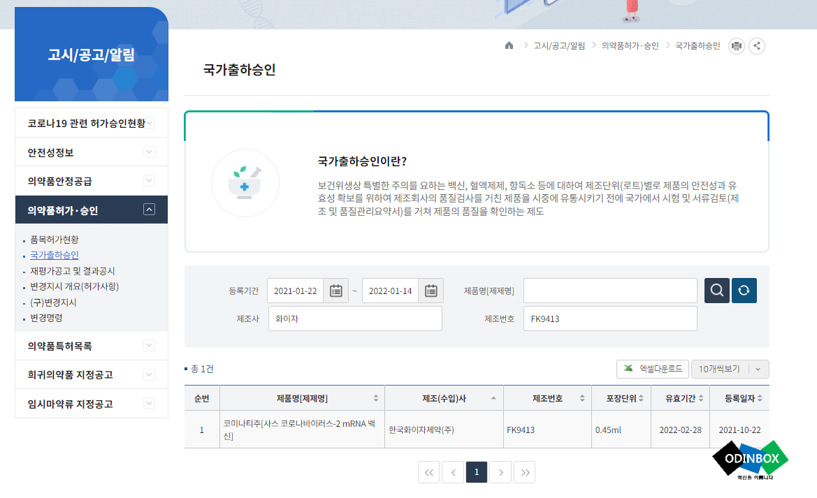 식품의약품안전처에서 운영하고 있는 의약품안전나라(의약품통합정보시스템)[#]라는 사이트가 있습니다. 해당 사이트로 접속을 합니다. 상단에 보이는 고시/공/알림 메뉴에서 의약허가/승인에서 국가출하승인을 선택합니다.