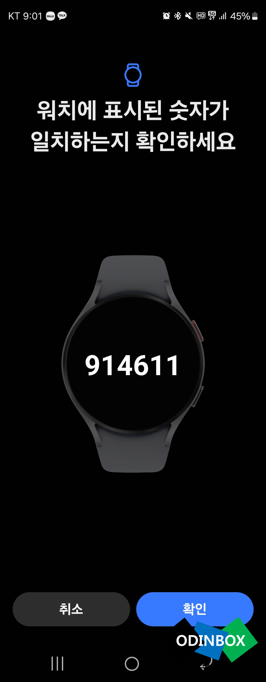 갤럭시워치6에 전원버튼을 꾹 눌러보았습니다. 잠시 기다려보니 삼성로고와 함께 부팅이 되기 시작합니다. 그리고 환영합니다!라는 글과 함께 잠시 후 숫자와 함께 스마트폰에서 연결하는 것과 맞는 것인지 확인을 해달라고 합니다. 스마트폰에서 Wearable(웨어러블)이라는 앱을 실행을 해서 블루투스 연결을 하여 사용을 하셔야 합니다.
