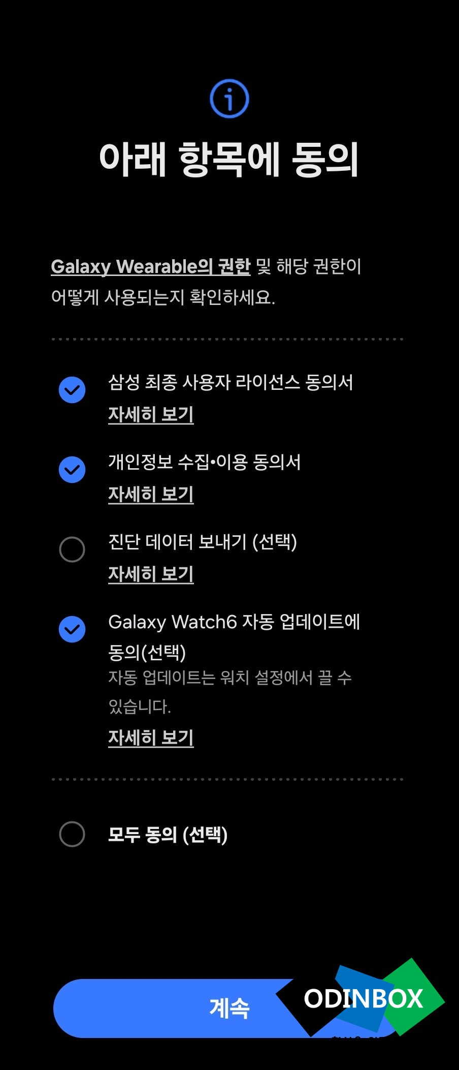 갤럭시 웨어러블을 사용을 하여 갤럭시워치와 연결을 하게 됩니다. 중간중간 허용과 함께 갤럭시 워치의 소프트웨어 다운로드 등 설정이 끝나게 되면 워치6 사용을 위한 준비는 끝이 나게 됩니다.