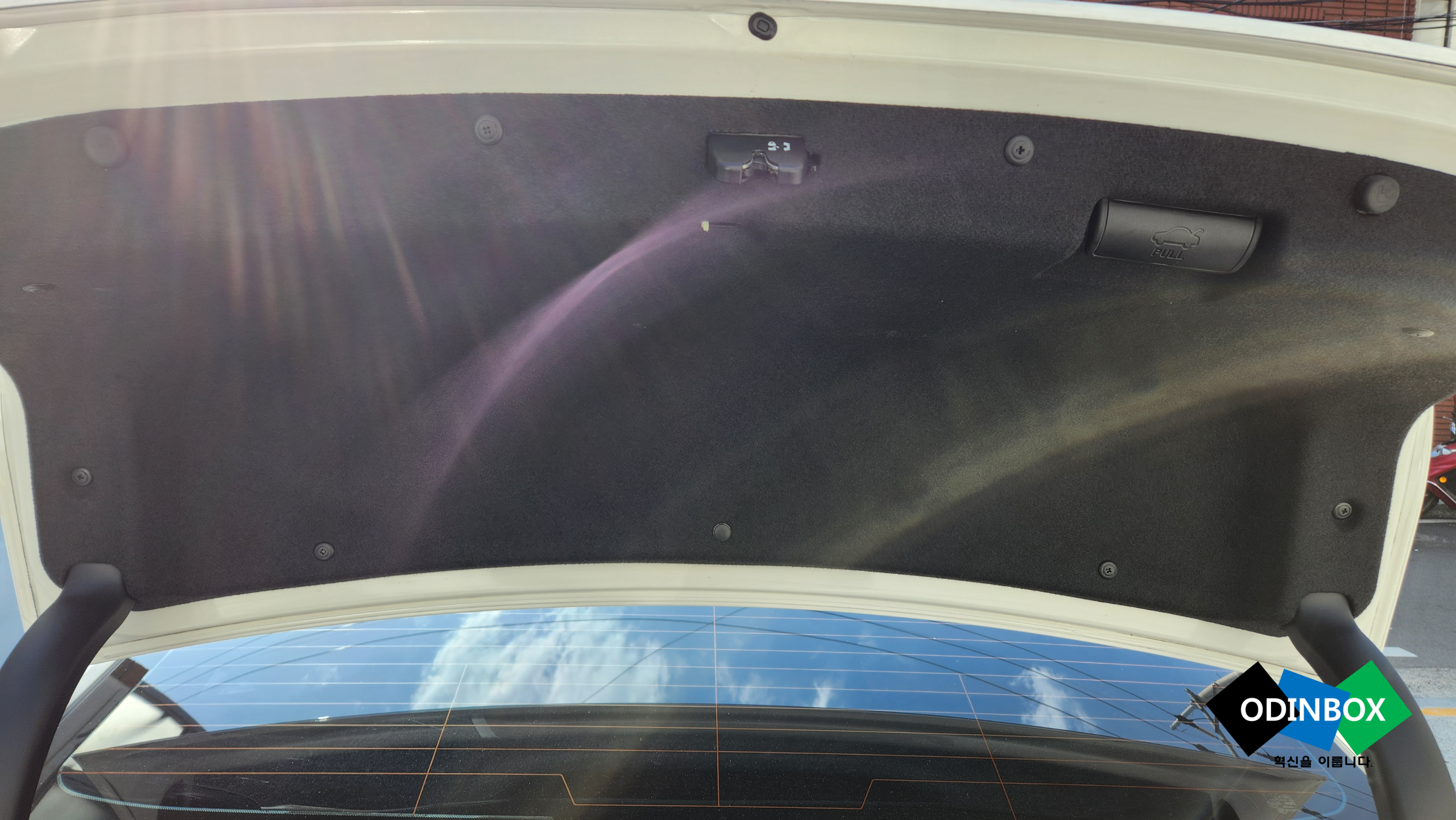 트렁크 번호판 위를 보면 버튼이 있고 그 위치 바로 뒤에 보면 안쪽으로 커넥터와 함께 뭉치가 연결이 되어 있습니다. 고정핀이 위아래 2개씩 양여에 2개씩 위치하고 있어 해당 부분을 탈거 뺄 수 있는데 손이 안 닿는 부분이 있어 몇 개만 빼고 부서져도 상관없다는 생각으로 탈거를 진행했습니다. 생각지 못하게 빼다가 주위 흠집이 생겨서 페인트붓으로 급하게 보수했습니다.