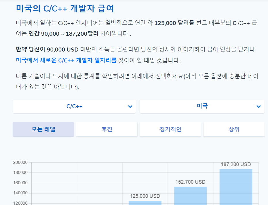 마지막 마무리 하기 전 보통 미국은 C와 C++로 월급이나 연봉의 수준이 어떤지에 대해서 알아봤습니다. 생각보다 많이 받고 있는 거 같습니다. 물론 사진 속 사람들과 다르게 있는 사람들도 많으며 평균이 원래는 낮아질 수 도 있기 때문에 그렇다는 생각을 했습니다.