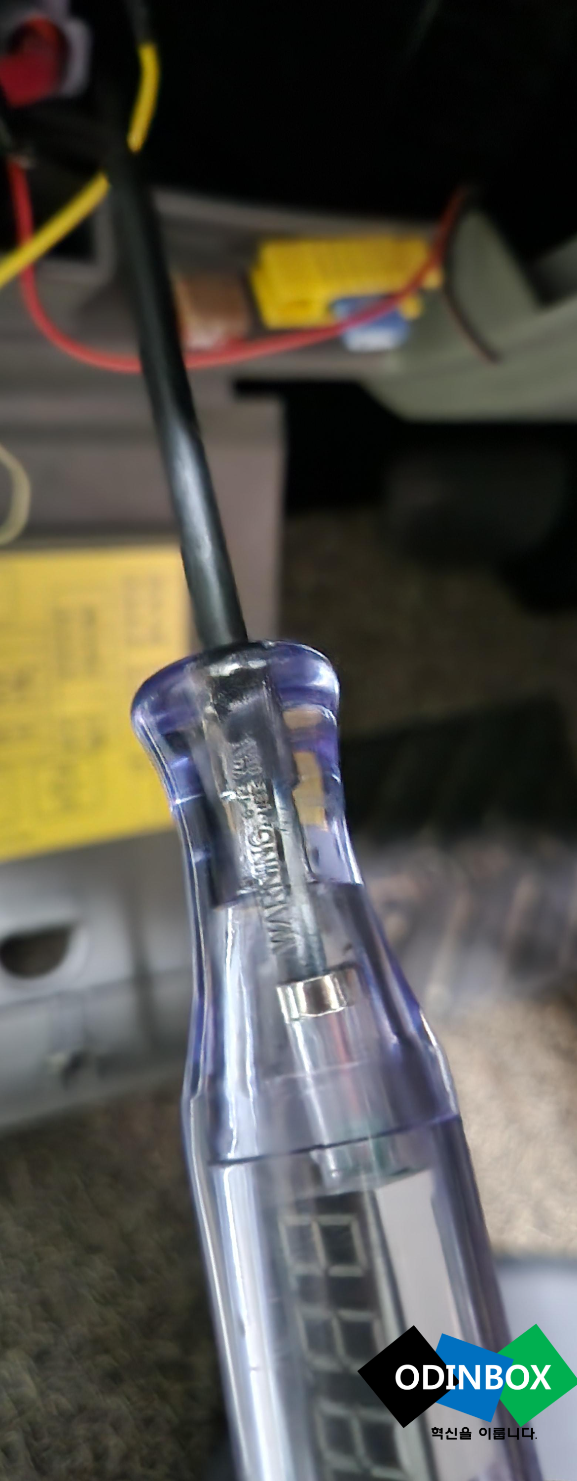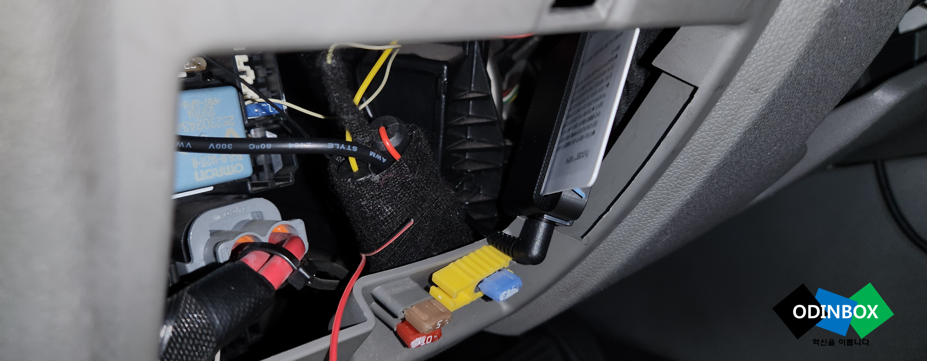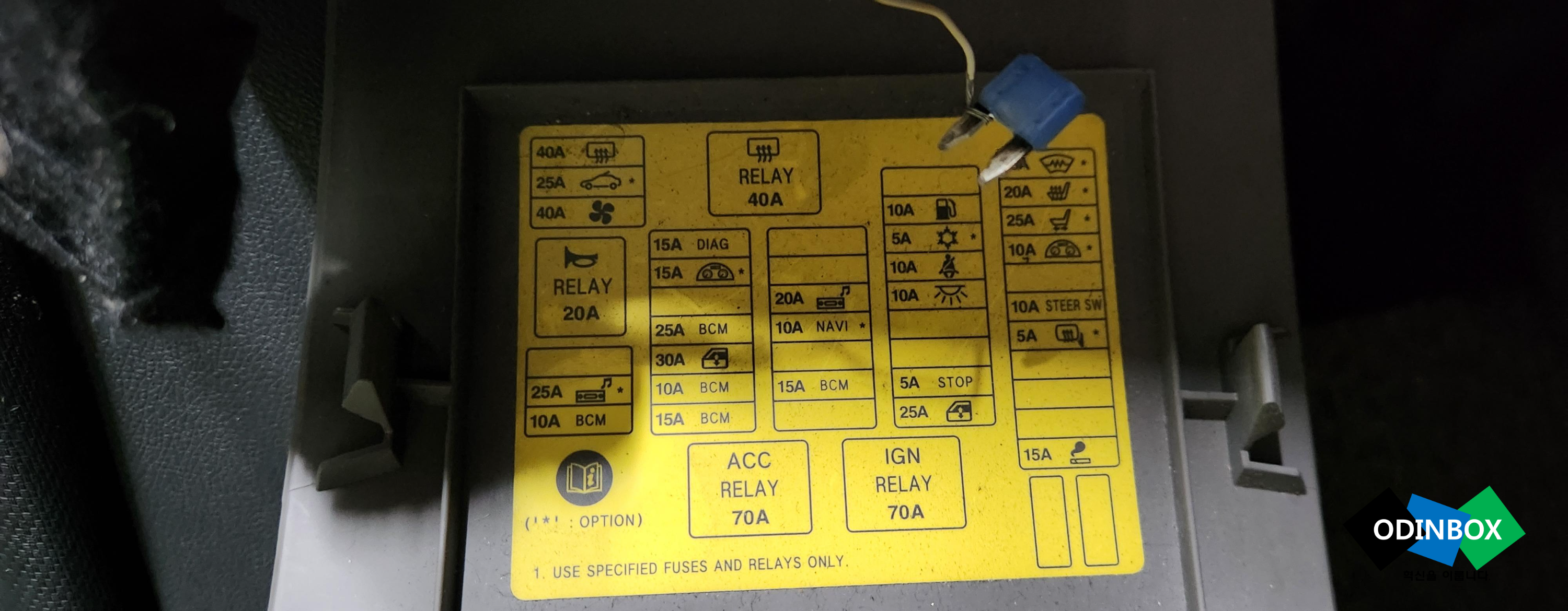 그리고, 퓨즈박스에 보면 차의 각 퓨즈들의 이름과 암페어등이 써져 있는 위치도가 보입니다, 여기서 우리는 시동이 걸려있을 때만 전원이 들어오는 것을 찾으면 됩니다. 보통 시동이 켜졌을 때 전기가 들어오는 곳에 하면 되는데 저의 경우 전압 테스터기가 있으면 하나하나 찔러보면서 전기가 흐르고 있는지 없는지 확인을 하면 편합니다. 저의 경우 확인을 해보니 STEER SW라는 곳이 적당한 것 같아 해당 퓨즈를 빼고 +부분에 피복을 감싸고 다시 꽂고 접지까지 마무리하고 다시 조립을 합니다. 조립이라고 해봤자 퓨즈박스 안쪽의 여분의 공간에 본체와 선들을 정리하여 넣어 마무리합니다. 그리고 난 뒤 반드시 테스트를 통해 정상적으로 기기가 되는지 확인을 합니다!