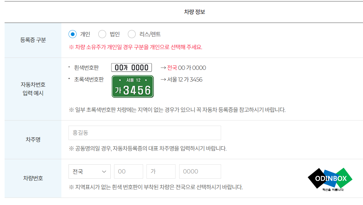 차량 정보에 등록증 구분, 차주명, 차량명을 입력합니다.