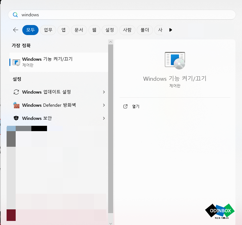 작업표시줄에 있는 검색창을 눌러 Windows 기능 켜기/끄기를 입력 후 사진과 같이 프로그램을 실행을 합니다.