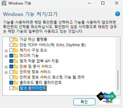 Windows 기능이 나옵니다, 해당 목록에 스크롤하여 아래로 내리게 되면 텔넷 클라이언트라는 것이 있습니다. 이 부분이 활성화가 되어있는지 확인을 하고 선택이 되어있지 않다면 선택 후 확인을 누르면 자동으로 변경된 사항이 있으면 작업이 이루어집니다.