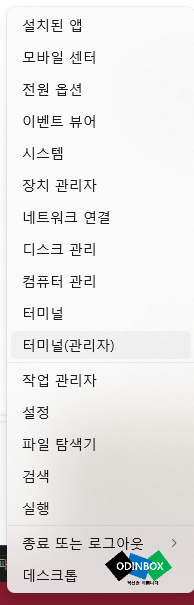 작업표시줄 윈도우 로고에서 오른쪽 마우스로 클릭하면 여러 메뉴가 나오게 됩니다. 해당 메뉴 중 터미널 또는 터미널 관리자로 실행을 하거나 또는 아까 검색창에서 cmd(명령프롬프트)를 입력을 하고 실행을 하면 됩니다. 그리고 난 뒤 아래와 같이 명령어를 입력하면 됩니다.