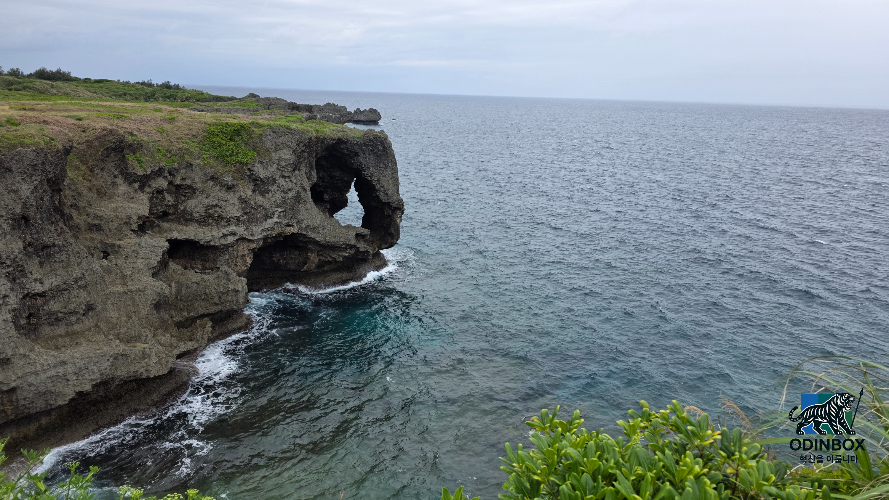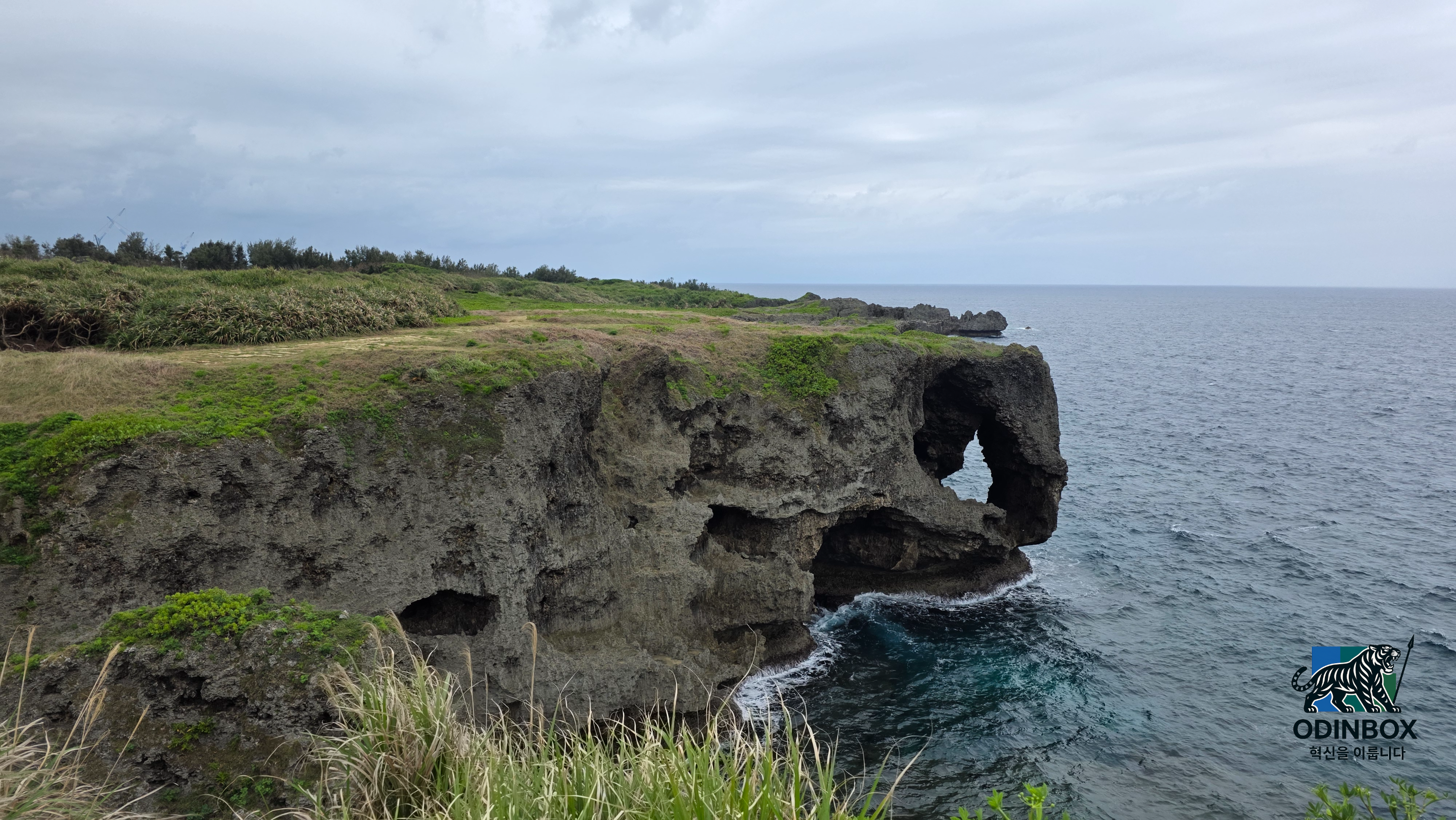 둘째 날, 첫 번째 방문지는 만좌모였습니다. 류큐왕국 시대, 왕이 '만 명이 앉아도 충분하다'라고 감탄한 장소로, 기이한 석회암 지형과 잔디밭, 그리고 바다 풍경이 인상적이었습니다. 비바람이 심하니 모자 착용은 주의가 필요합니다.