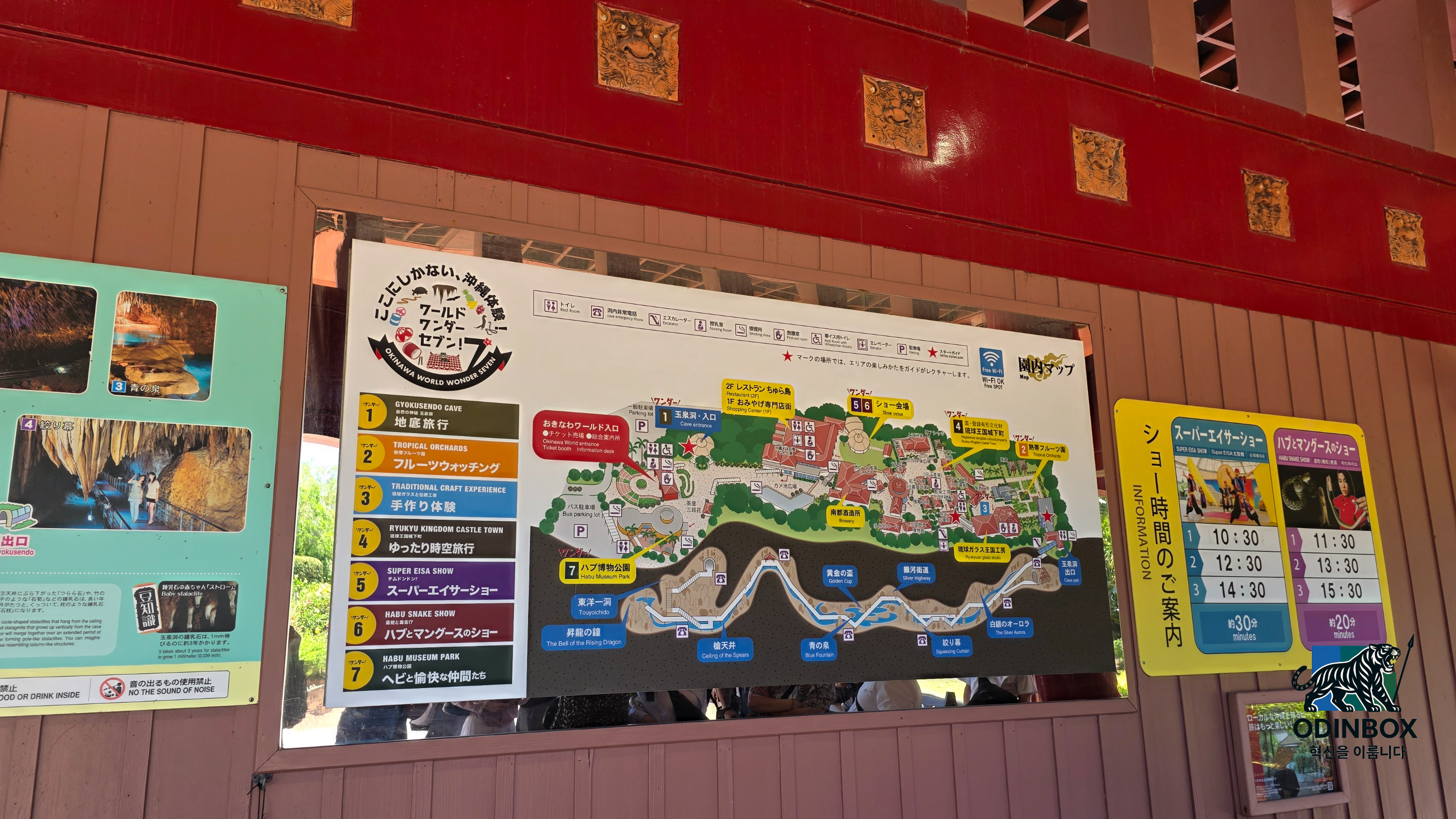 식사 후에는 오키나와 월드를 방문하였습니다. 이곳은 민속촌, 전통체험, 반시뱀 박물관 등이 있는 테마파크로, 특히 교쿠센도 동굴은 약 30만 년 전에 형성된 오키나와 최대의 석회동굴로 알려져 있습니다. 전체 길이는 약 5km이며, 그중 850m가 일반에 공개되어 있습니다. 동굴 내부는 평균 온도 21°C, 습도는 80% 이상으로, 장시간 걷기에는 다소 힘들 수 있습니다.