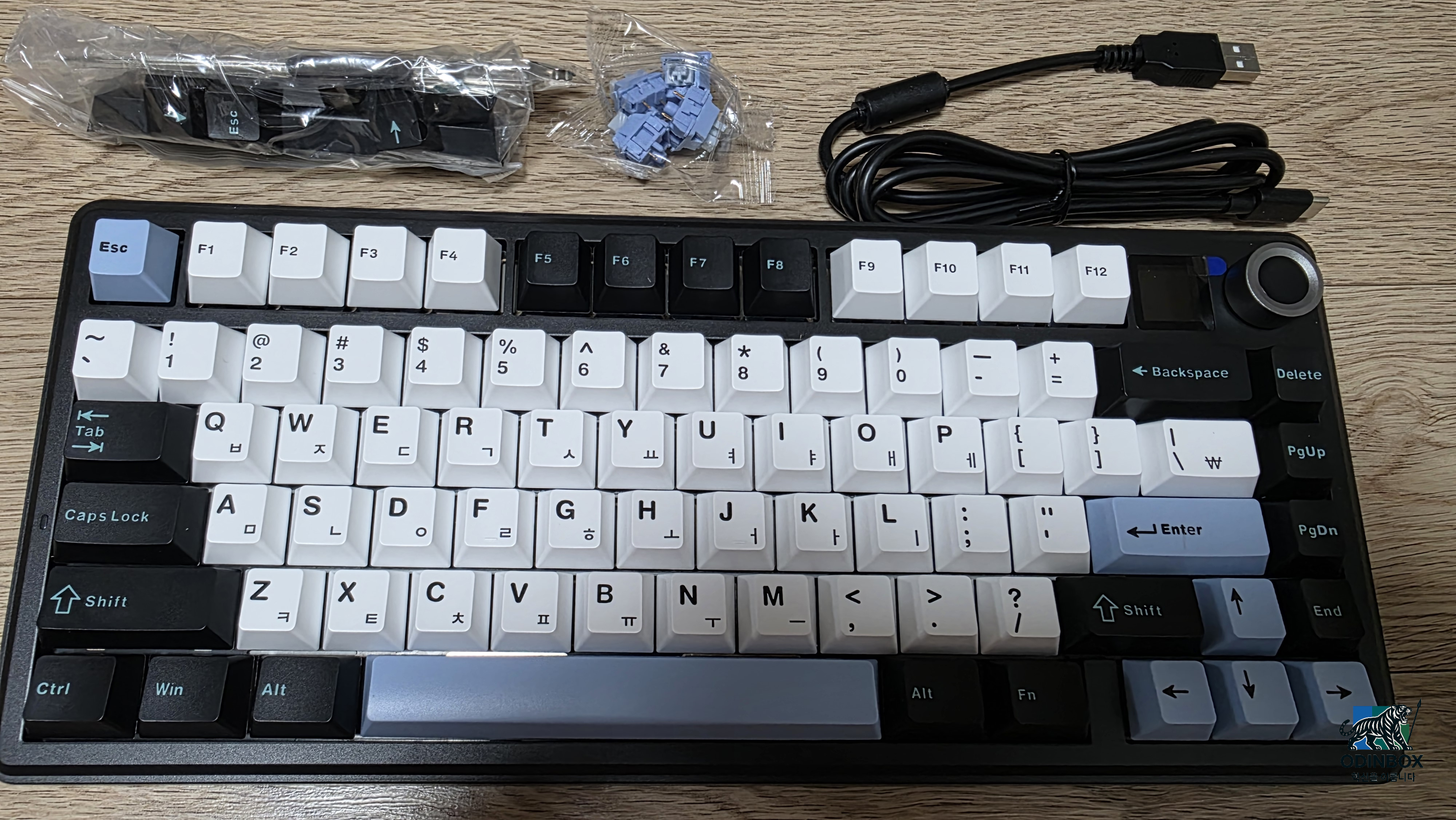 제품을 받아 개봉하면서 가장 먼저 느낀 것은 구성품이 알차다는 것이었습니다. 박스를 열어보니 키보드 본체와 함께 무선 연결을 위한 2.4GHz USB 동글, 탈착식 USB-C 케이블 그리고 키캡 리무버와 스위치 리무버가 일체형으로 된 도구가 동봉되어 있습니다. 사용자 설명서도 포함되어 있어 처음 사용하는 사람도 기능을 쉽게 익힐 수 있게 배려한 모습이었습니다. 키보드를 손에 들었을 때는 묵직한 무게감에 놀랐는데 스펙상 약 1kg에 달하는 무게로 작은 크기 대비 상당히 단단한 느낌을 줍니다. 하우징은 ABS 소재의 일체형 케이스지만 군더더기 없는 마감이 되어있고 들뜸이나 유격 없이 탄탄한 빌드 퀄리티를 첫인상부터 확인할 수 있었습니다. 색상은 제가 선택한 스카이 블랙의 경우 블랙 바디에 포인트 컬러 키캡이 어우러져 세련된 인상을 주었고 키캡에 한글 각인까지 되어져 있습니다.